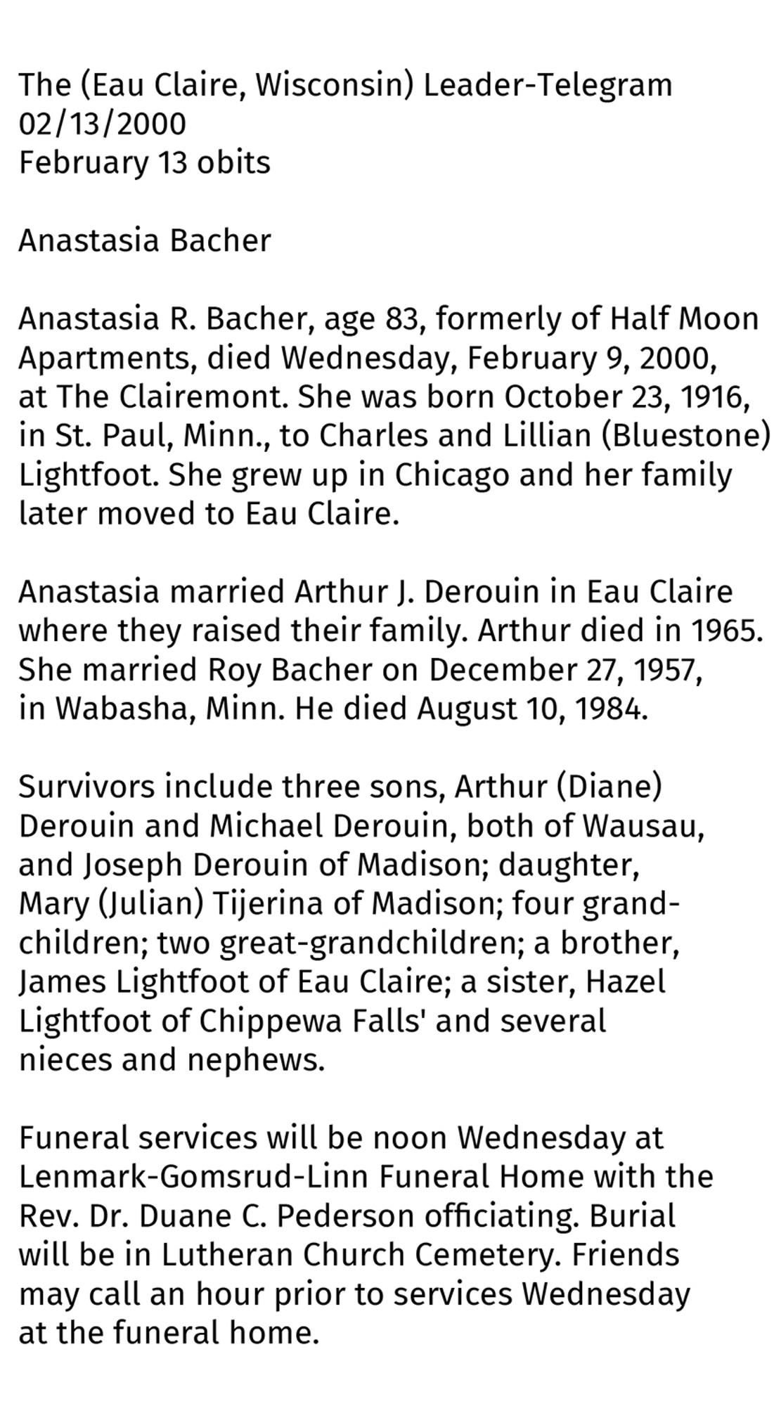 • Her obituary was published in the Unknown newspaper on 4 April 1907 in Owatonna, MN. Called to the Great Beyond