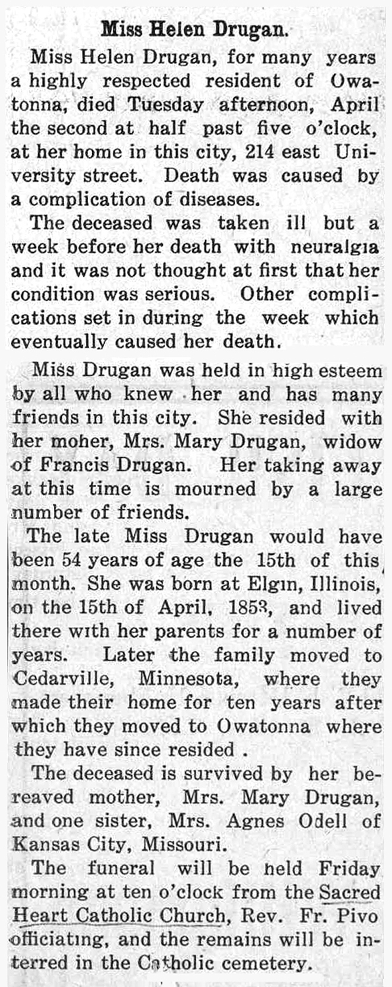 Miss Helen Drugan, for many years a highly respected resident of Owatonna, died Tuesday afternoon, April the second at half past five o'clock, at her home in this city, 215 east University street. Death was caused by a complication of diseases.