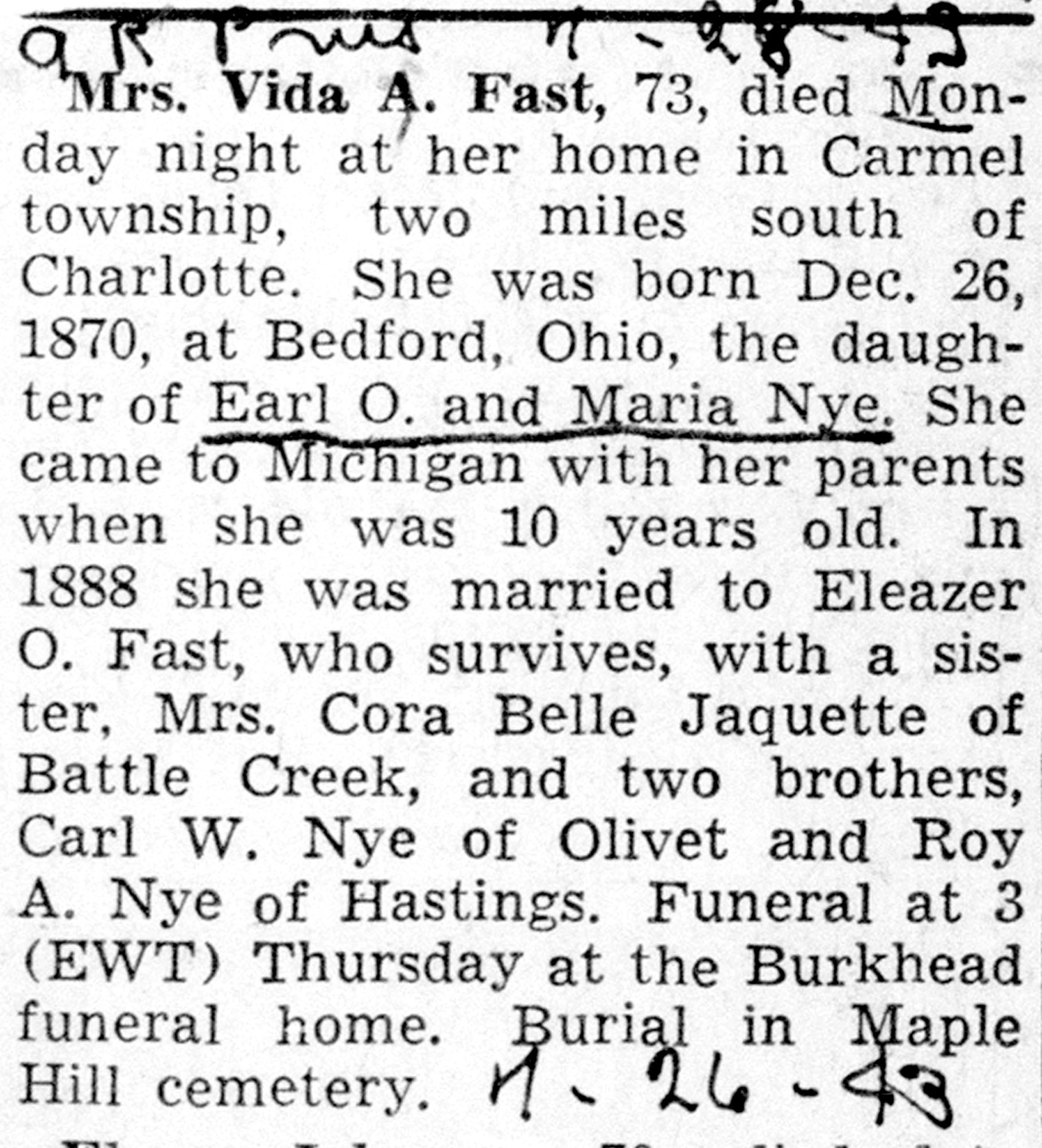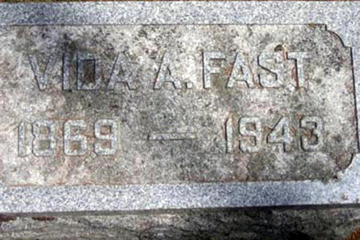 • She was buried on 29 July 1943 in the Maple Hill Cemetery in Charlotte, MI. Vida married Eleazer O. Fast, son of Joshua B. Fast and Susanne Strouse, on 12 March 1888 in Walton, MI.1 2 3 4 (Eleazer O. Fast was born in July 1862 in Ohio,1 2 6 7 died in 1956 7 and was buried in 1956 in Maple Hill Cemetery, Charlotte, MI 7.)
