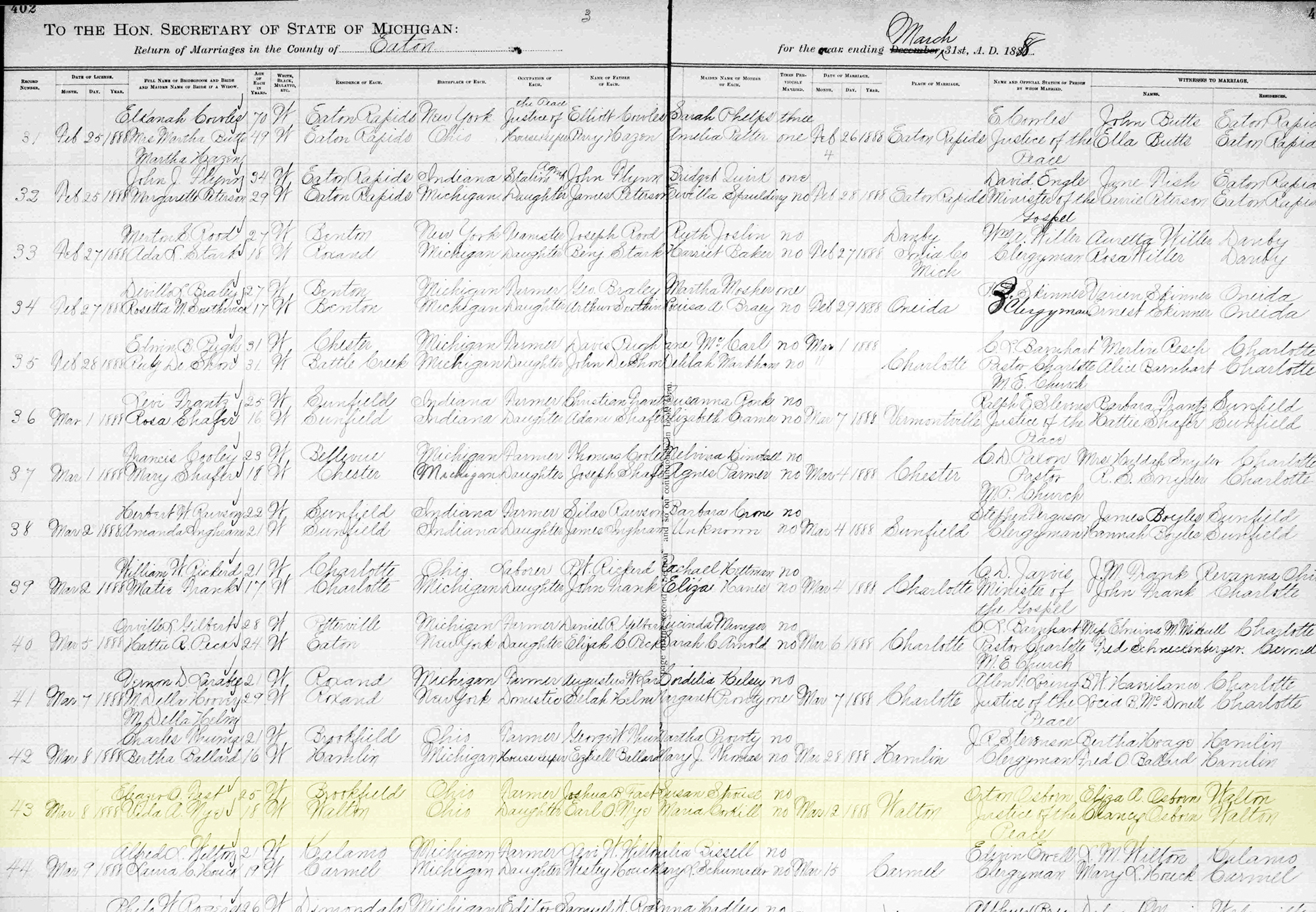 1 "Michigan Marriages, 1868-1925," database with images, FamilySearch (accessed 18 January 2021), (https://www.familysearch.org/ark:/61903/1:1:N3ND-T9F : 9 November 2020), Eleazer O. Fast and Vida A. Nye, 12 Mar 1888; citing Marriage, Walton, Eaton, Michigan, Citing Secretary of State, Department of Vital Records, Lansing; FHL microfilm 4207677.