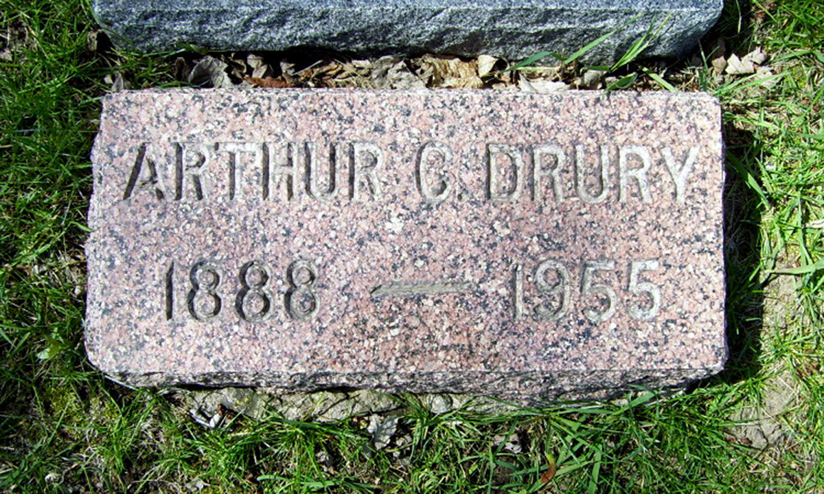 Find A Grave, database and images (https://www.findagrave.com/ : accessed 29 Jan 2018); memorial page for Arthur C. Drury (1888'961955), Find A Grave Memorial no. 51336100, citing Elmhurst Cemetery, Saint Paul, Ramsey County, Minnesota, USA ; Maintained by Lowell Pankake (contributor 8662161) .