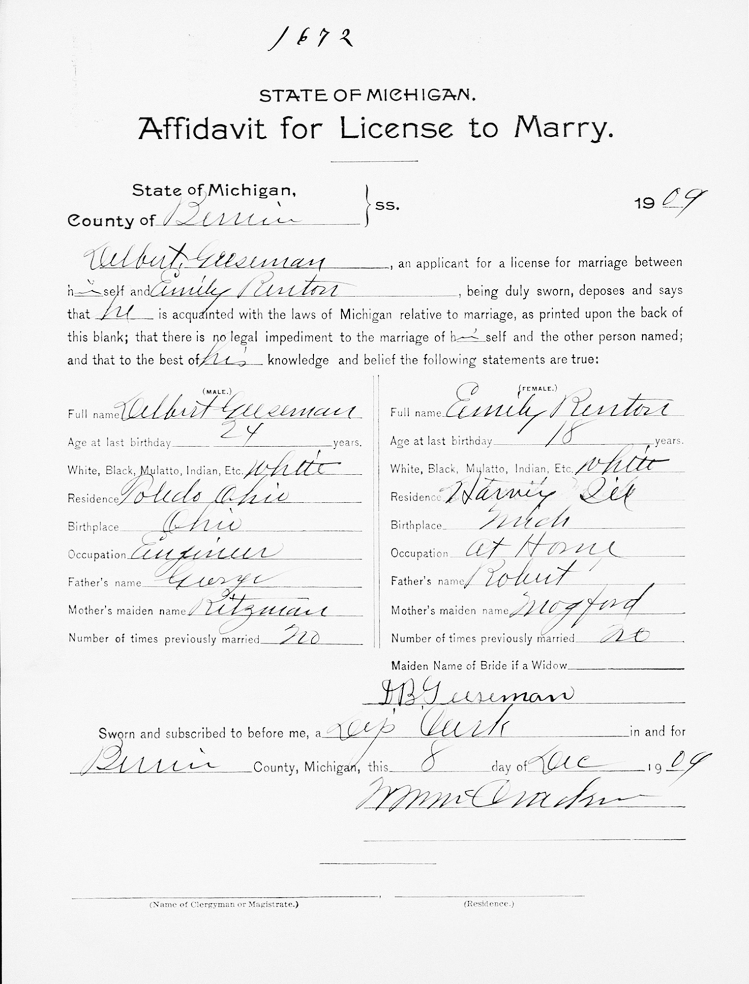 Name: Delbert Guseman Spouse's Name: Emily Renton Event Date: 08 Dec 1909 Event Place: St Joseph, Berrien, Michigan Father's Name: George Spouse's Father's Name: Robert Spouse's Mother's Name: Mogford
