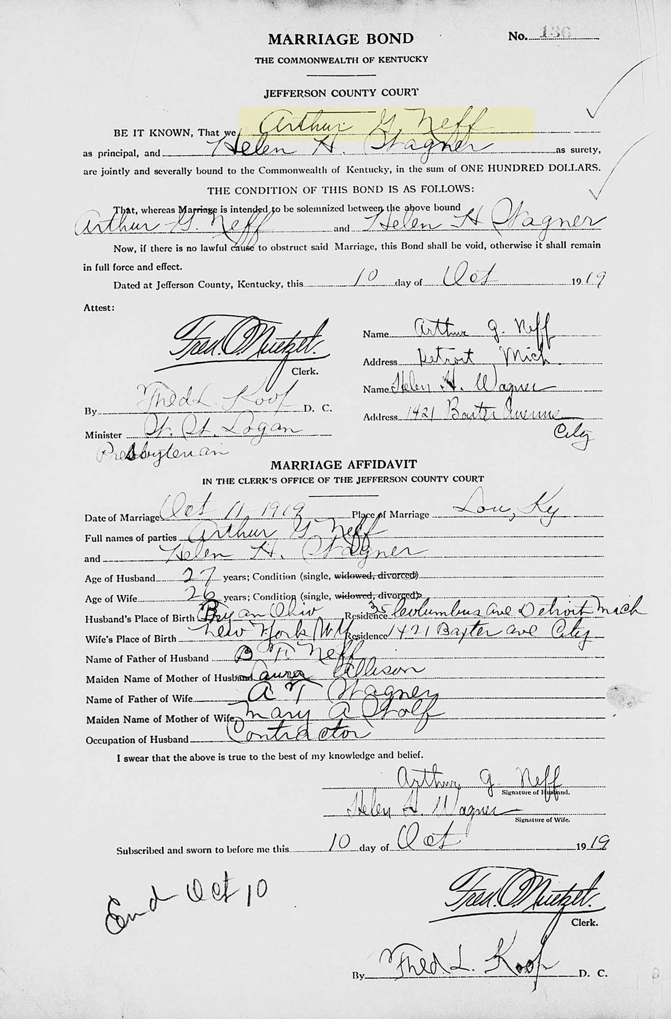 • Marriage Image: 11 October 1919, in Louisville, KY. • They appeared on the 1920 US Census in Detroit, MI on 14 January 1920. 1 • Arthur Guy Neff and Helen Henrietta Wagner were divorced before 1930.