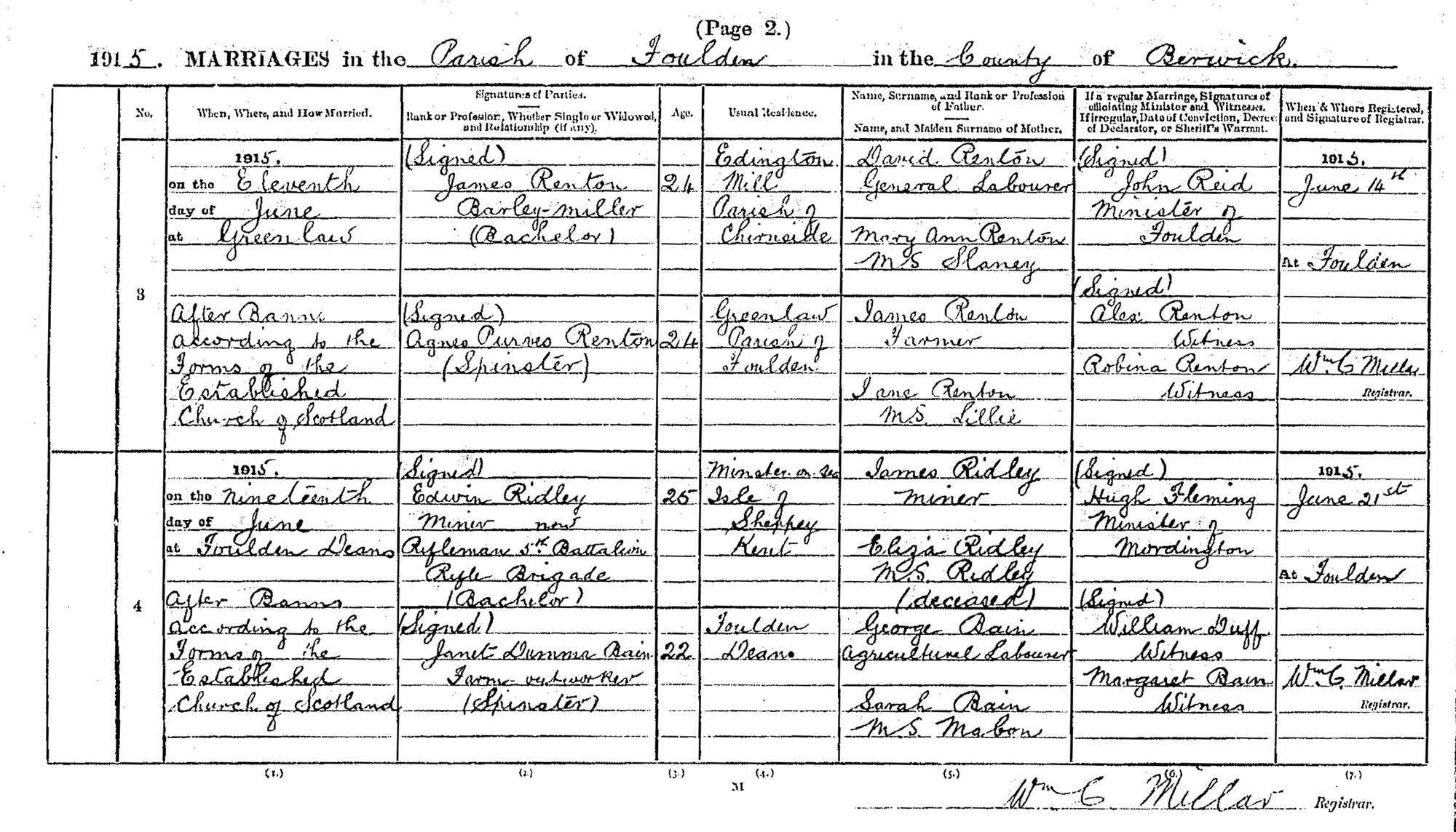 1 1915 Marriage Register of Foulden Parish, Berwickshire, Scotland: p. 2, James Renton-Agnes Purves Renton, 11 June 1915.