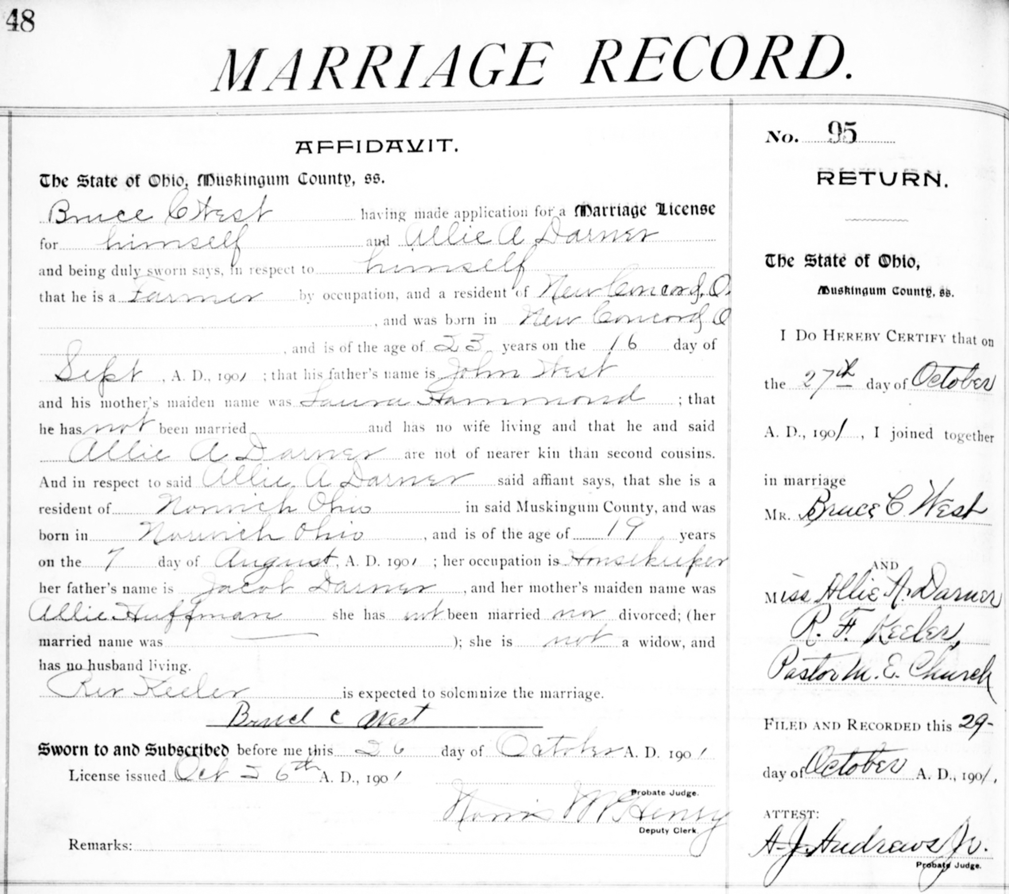 1 "Ohio, County Marriages, 1789-2016," database with images, FamilySearch.org (accessed 27 Feb 2014); Name: Bruce C. West; Event Date: 27 Oct 1901; Event Place: Muskingum, Ohio.