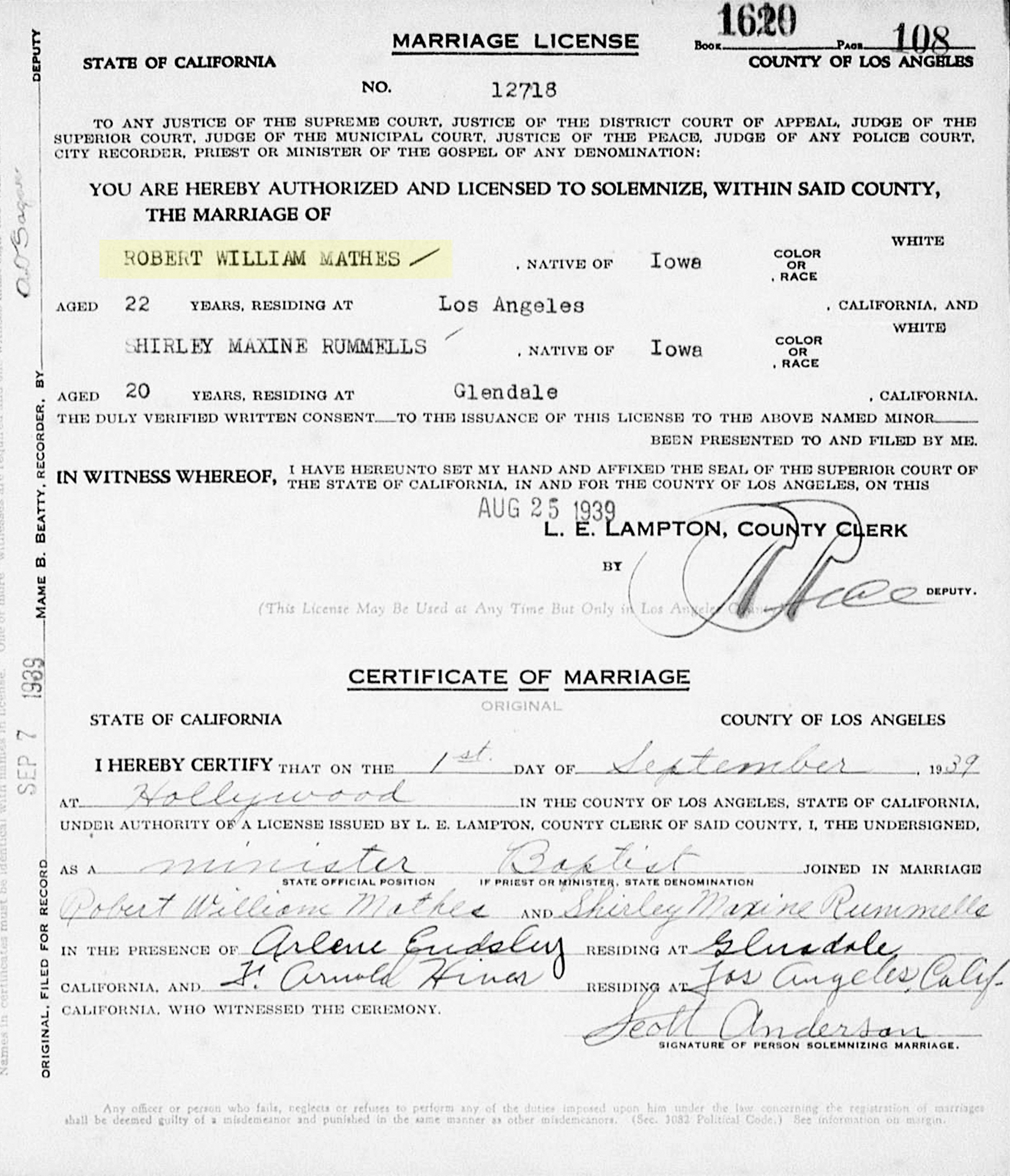 1 "California, County Marriages, 1850-1952," database with images, FamilySearch (https://familysearch.org/search/collection/1804002 : accessed 2 Dec 2019); Robert William Mathes and Shirley Maxine Rummells, 01 Sep 1939; citing Los Angeles, California, United States, county courthouses, California; FHL microfilm 2,114,341.
