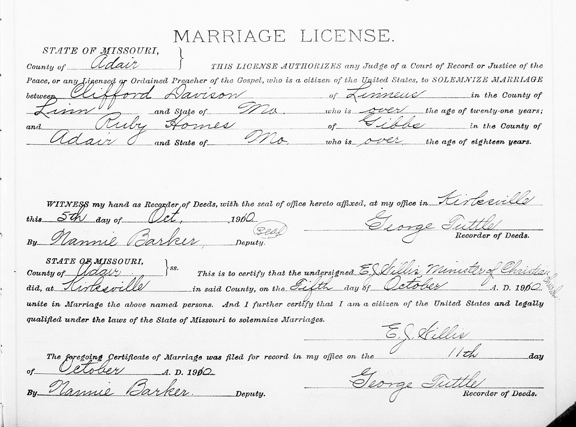1 "Missouri, County Marriage, Naturalization, and Court Records, 1800-1991," database with images, FamilySearch (https://www.familysearch.org/search/collection/2060668 : accessed 16 May 2020), Ruby Homes in entry for Clifford Davison, 5 Oct 1910; citing Marriage, Adair, Missouri, United States, Missouri State Archives, Jefferson City; FHL microfilm 007425054.