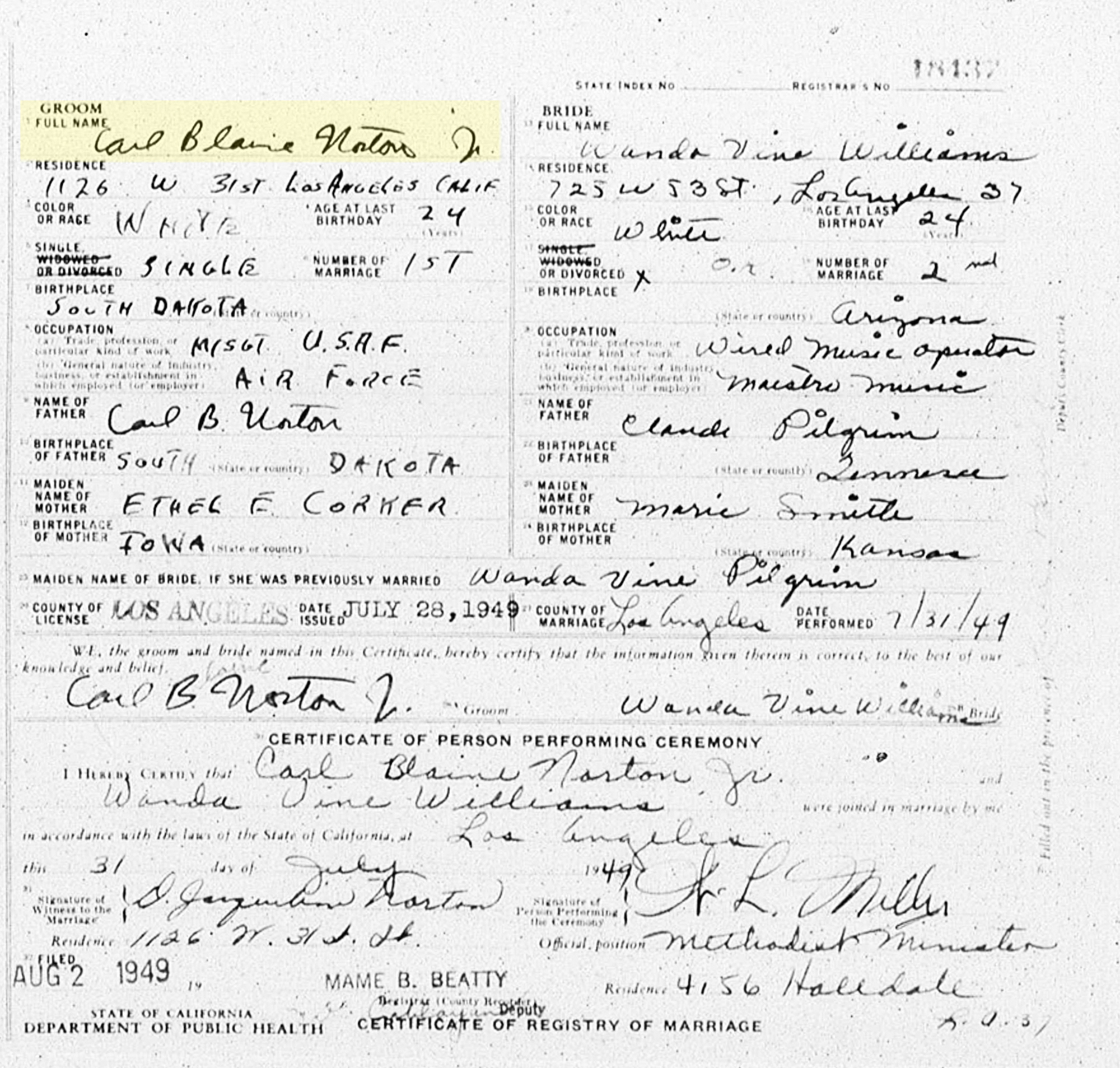 1 "California, County Marriages, 1850-1952," database with images, FamilySearch (https://familysearch.org/search/collection/1804002 : accessed 8 January 2021); (https://www.familysearch.org/ark:/61903/1:1:K82S-7WG : 5 January 2021), Carl Blaine Urton and Wanda Vina Williams, 31 Jul 1949; citing, California, United States, county courthouses, California; FHL microfilm 2,117,335.