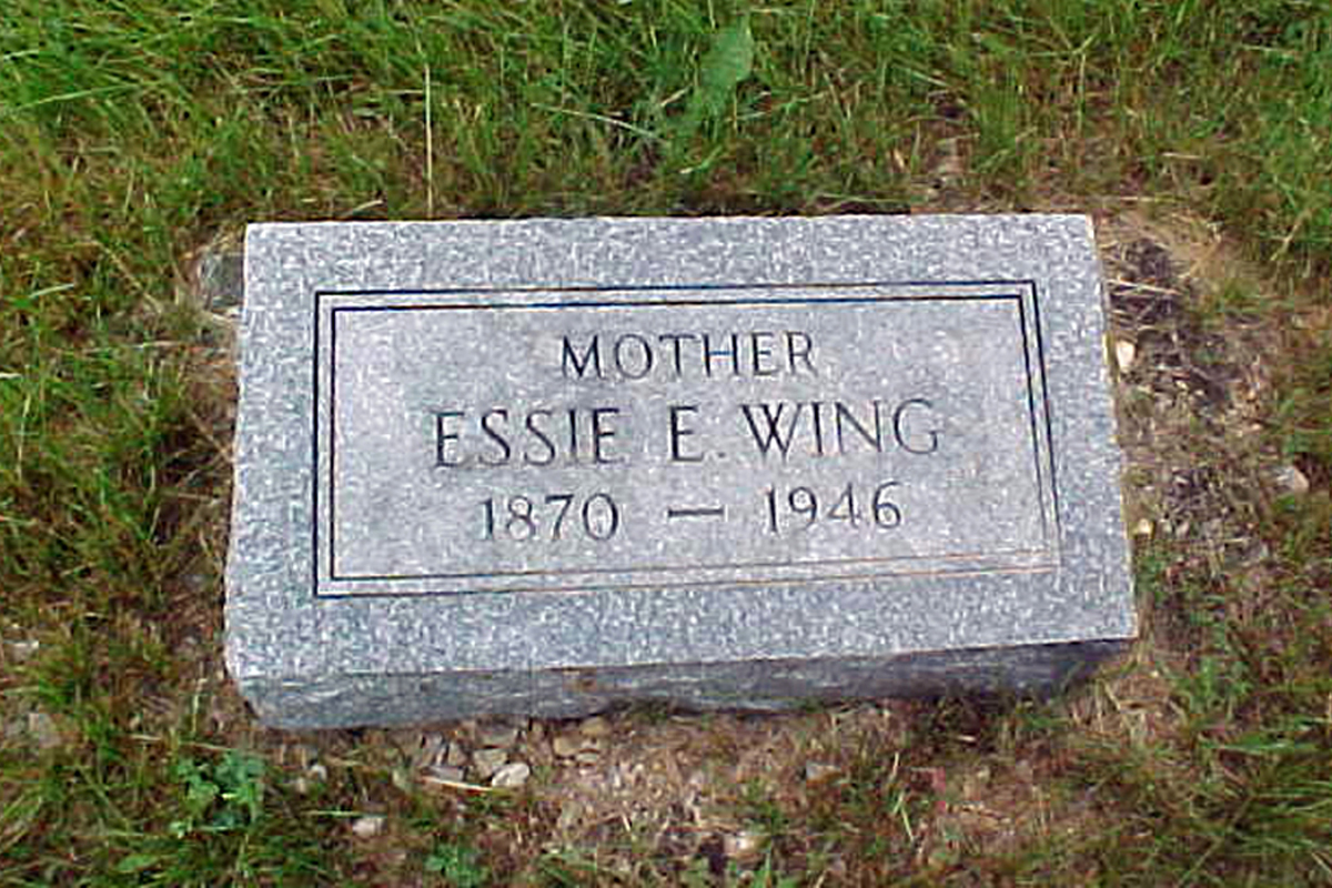 2 Find A Grave, database and images (https://www.findagrave.com/ ); accessed 28 May 2019), memorial page for Essie E Woods Wing (3 Apr 1870\endash 18 Oct 1946), Find A Grave Memorial no. 13504725, citing Evergreen Cemetery, Prairie du Chien, Crawford County, Wisconsin, USA