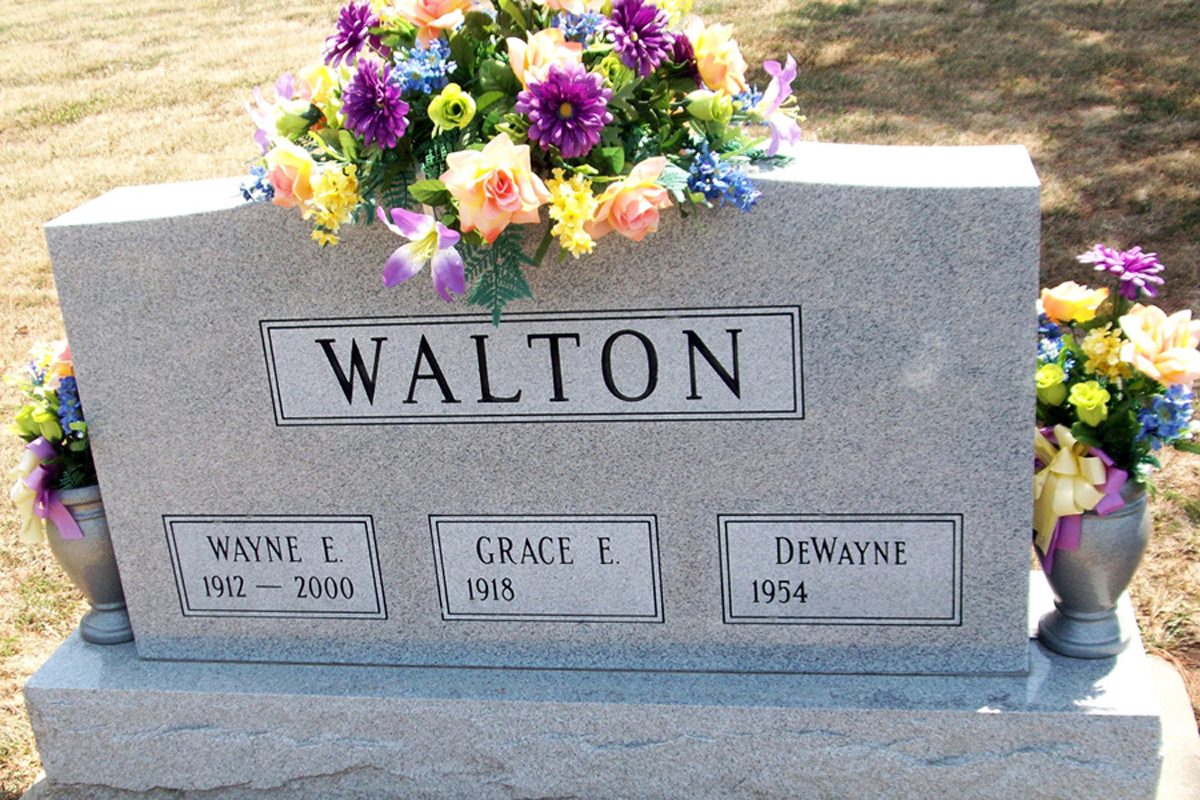 Grace married Wayne E. Walton on 1 June 1952. (Wayne E. Walton was born in 1912,3 died on 9 August 2000 3 and was buried after 9 August 2000 in Vandalia, IL 3.)
