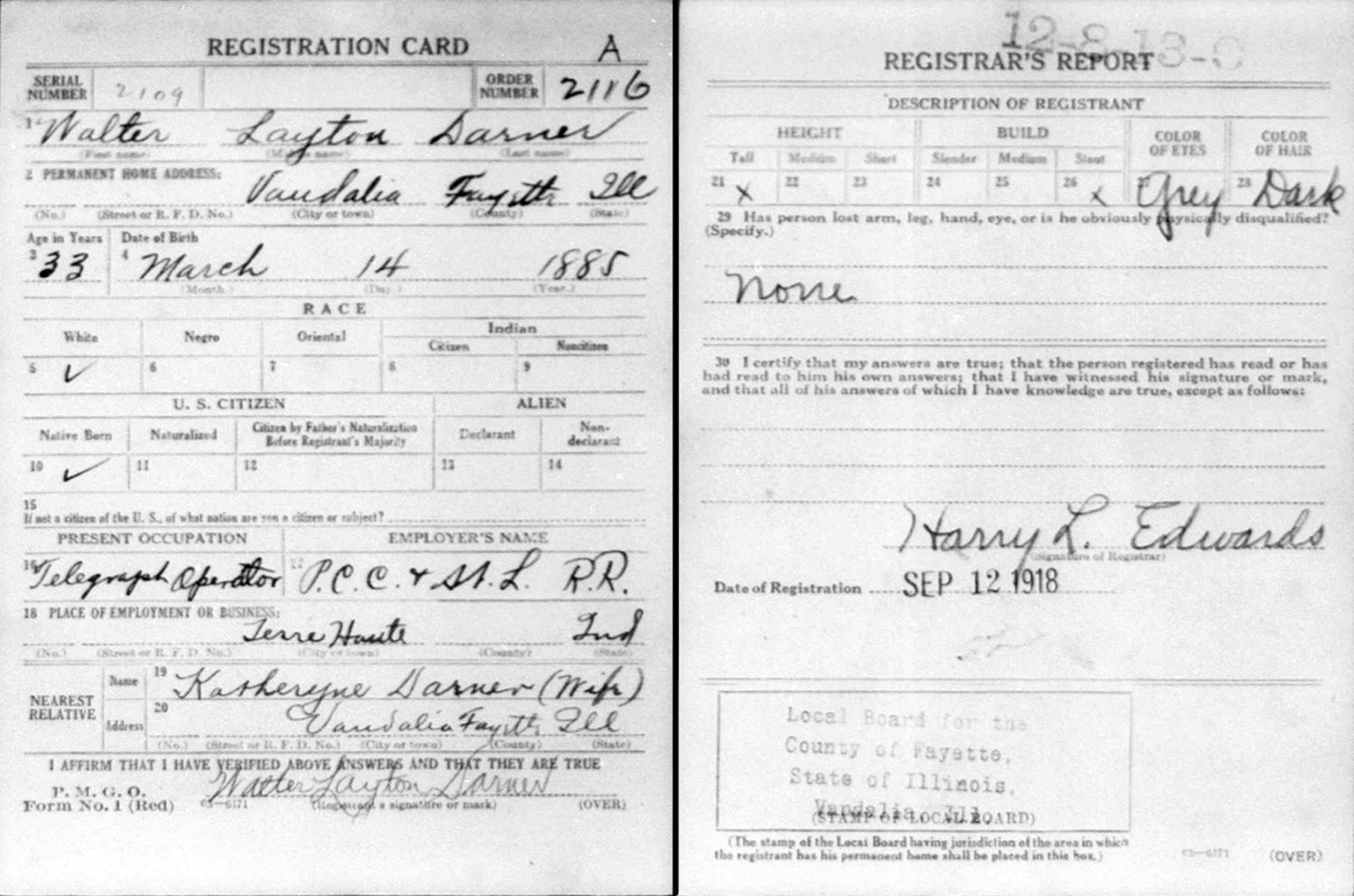 7 "United States World War I Draft Registration Cards, 1917-1918," database with images, FamilySearch.org (accessed 4 Mar 2014); Name: Walter Layton Darner; Event Place: Fayette County, Illinois.