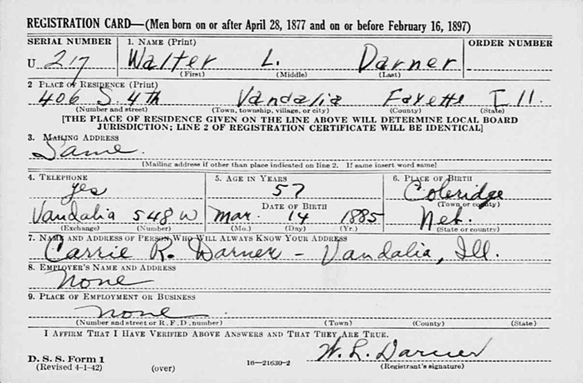 • Walter Layton Darner registered for WW II Draft: 1942, Vandalia, IL.