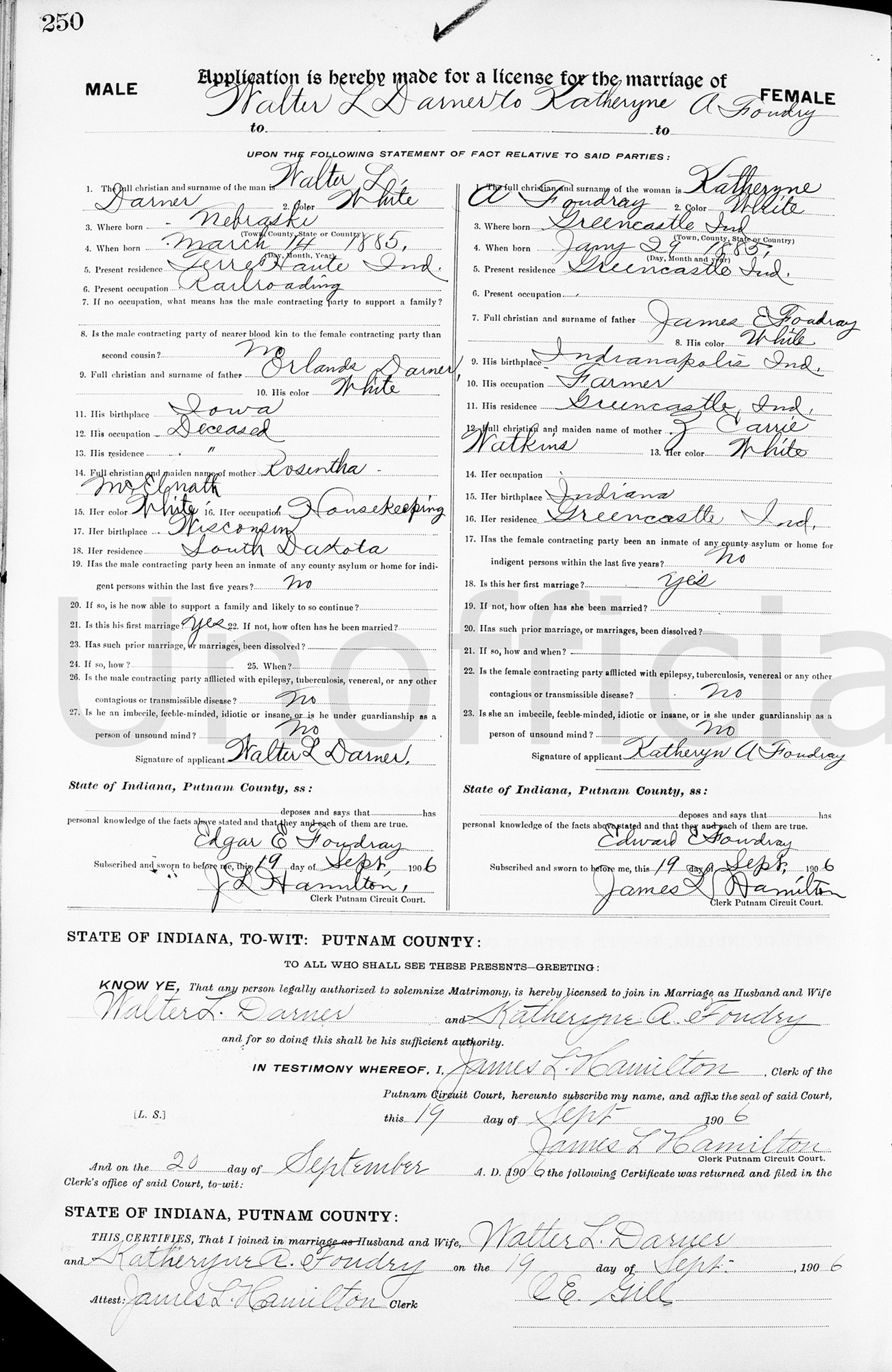 1 "Indiana Marriages, 1811-2019," database with images, FamilySearch (accessed 4 Mar 2014); Walter L Darner and Katheryne A Foudray, 19 Sep 1906; citing Putnam, Indiana, United States, Marriage Registration, Indiana Commission on Public Records, Indianapolis; FHL microfilm 005014428.