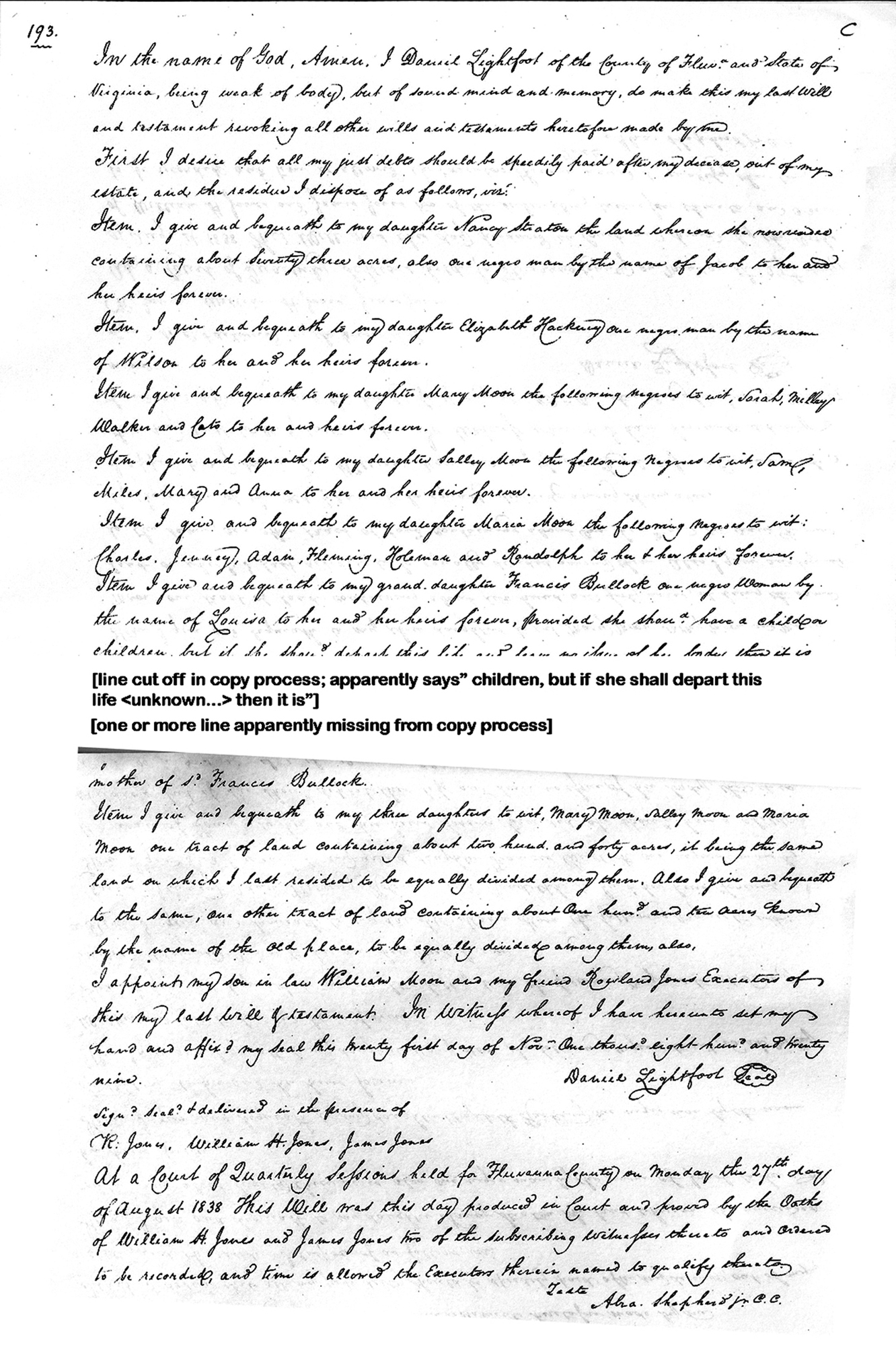 • He signed a will on 21 November 1829 in , Fluvanna County, VA. In the name of God, Amen,I Daniel Lightfoot of the County of Fluvanna and State of Virginia, being weak of body, but of sound mind and memory, do make this my last will and testament reworking all other wills and testaments heretofore made by me.