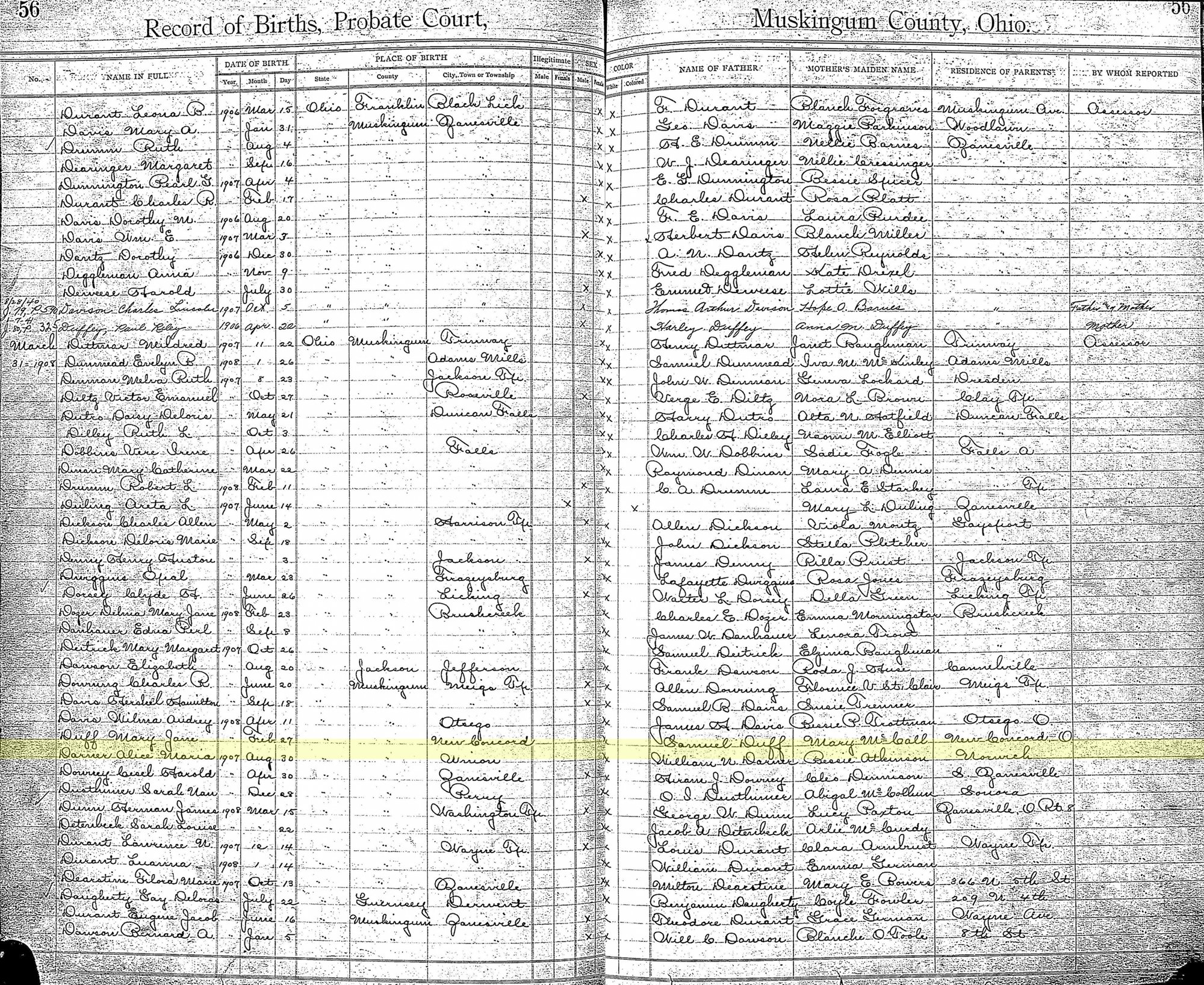 Name: Alice Maria Darner Event Type: Birth Event Date: 30 Aug 1907 Event Place: Union, Muskingum, Ohio, United States Gender: Female Race: W Father's Name: William N. Darner Mother's Name: Bessie Atkinson