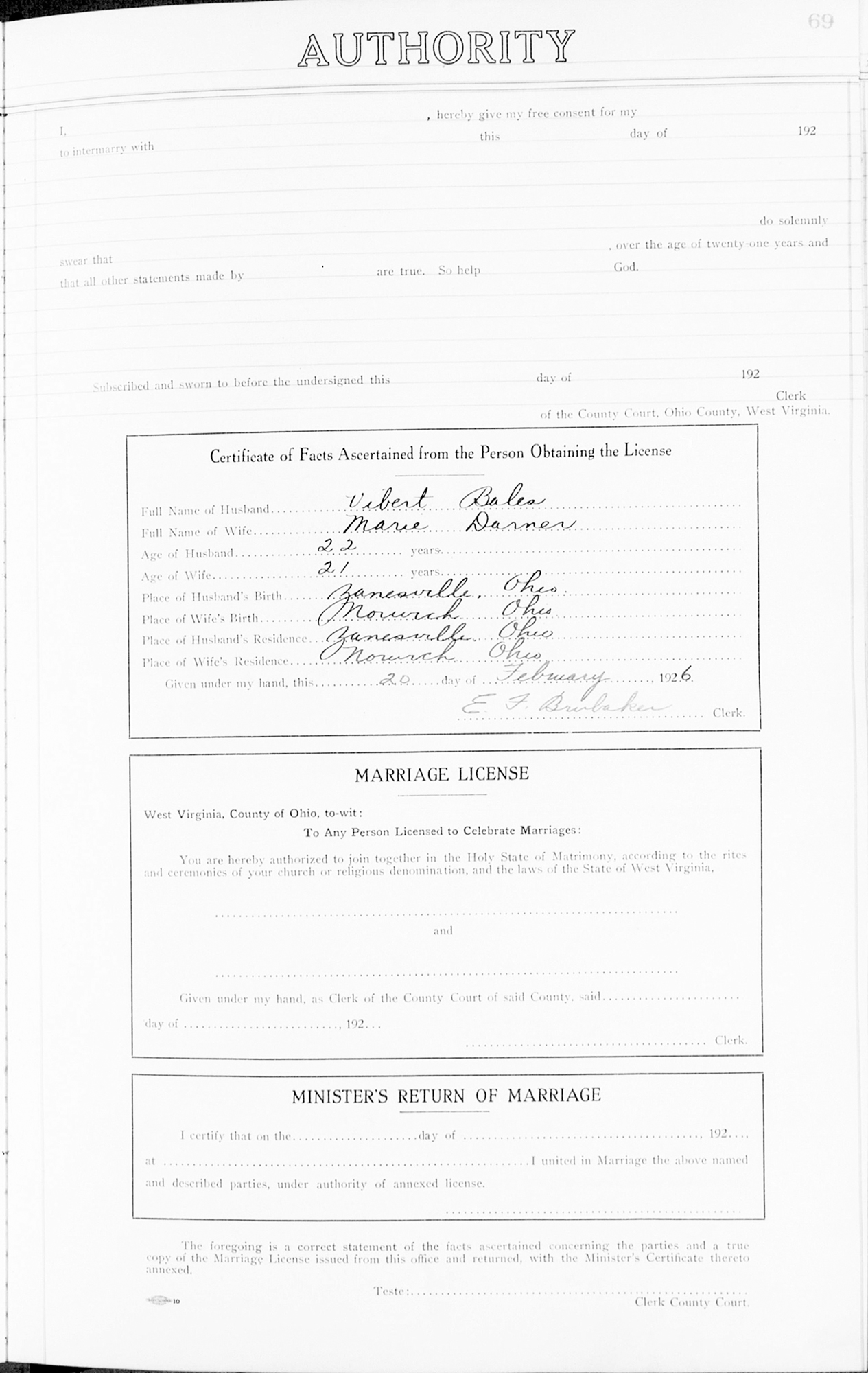 Name: Vibert Bales Spouse's Name: Marie Darner Event Type: Marriage Event Date: 1926 Event Place: Ohio, West Virginia, United States Affiliate Repository Type: County Records