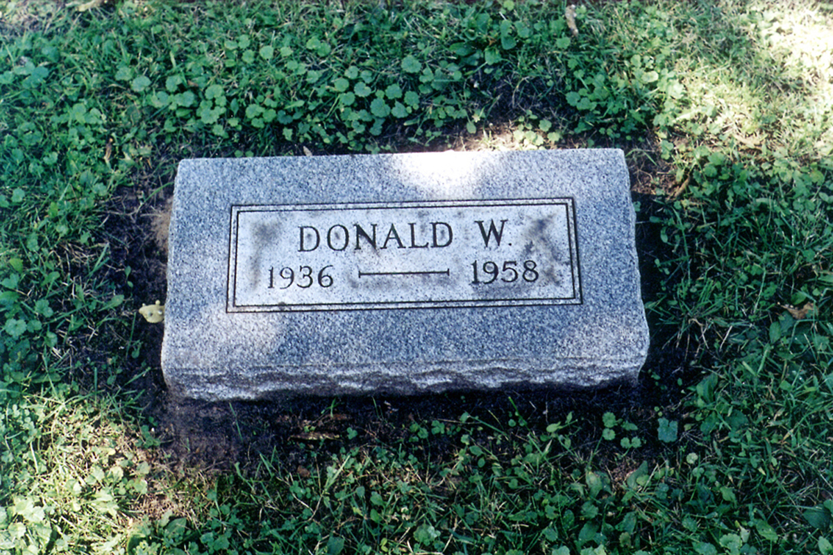 His gravestone is a small flat monument of gray granite near that of his parents. The inscription reads "Donald W., 1936-1958". Plot: Section 56 Find A Grave Memorial #99439034 --------------------------------------------- . 1