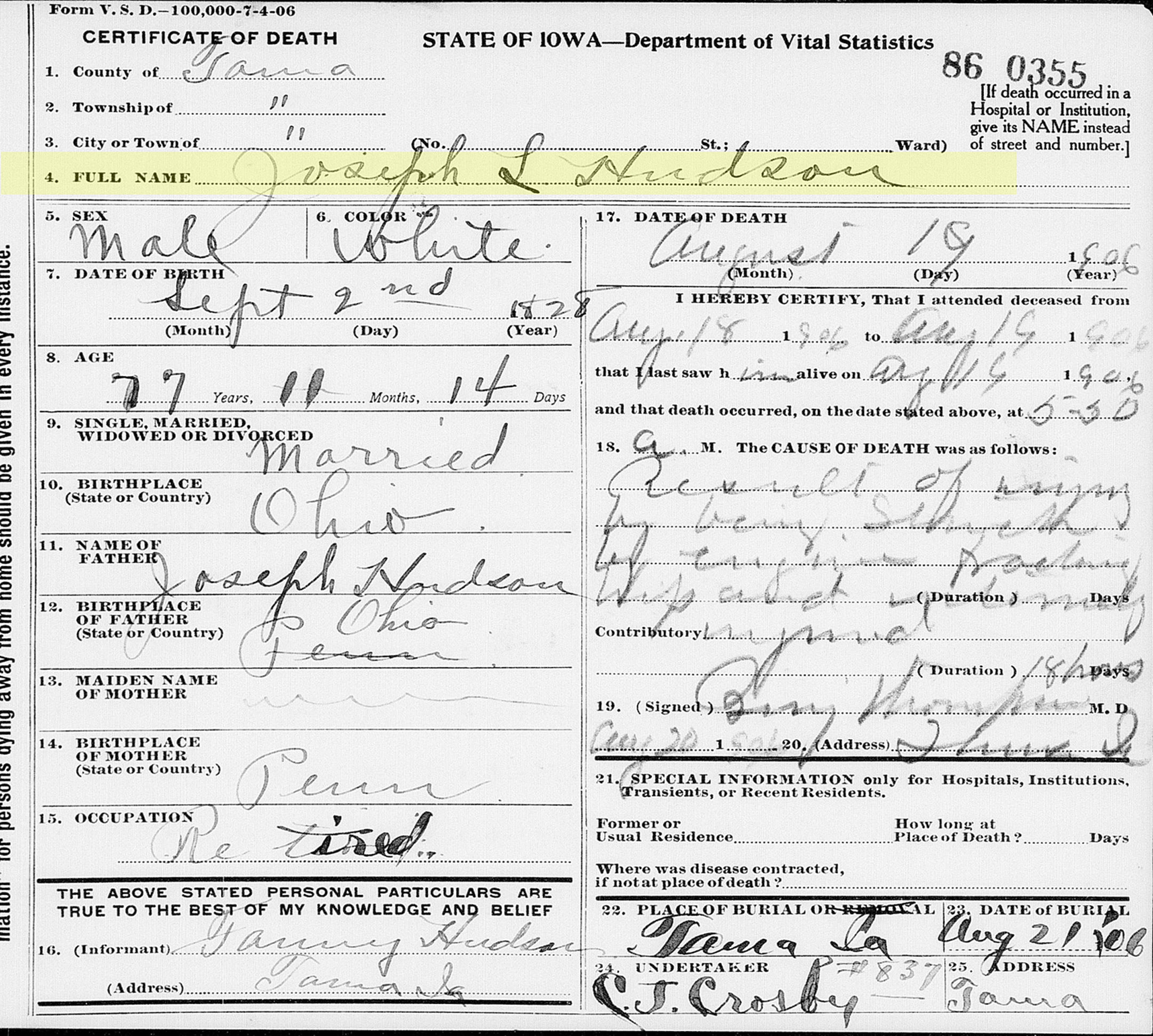 6 "Iowa, Death Records, 1904-1951," database with images, FamilySearch (https://www.familysearch.org/search/collection/2531337 : accessed 9 March 2021), (https://familysearch.org/ark:/61903/1:1:78QL-R92M : 18 October 2019), Joseph L Hudson, 19 Aug 1906, Tama, Tama, Iowa, United States; citing certificate #, State Historical Society of Iowa, Des Moines; FamilySearch digital folder 102902999.
