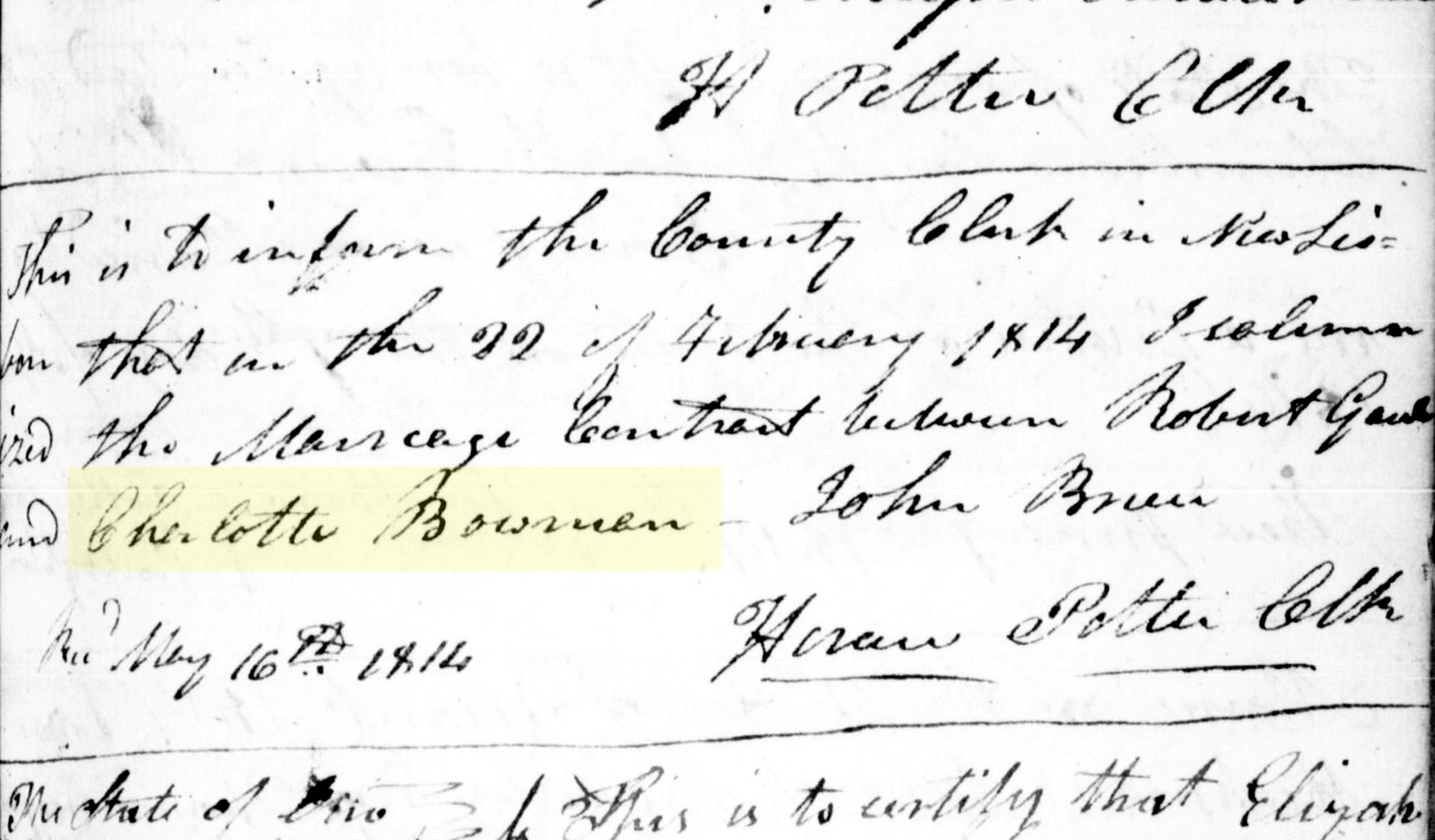 1 "Ohio Marriages, 1800-1958," database, FamilySearch (https://familysearch.org/search/collection/1681001 : accessed 5 March 2021), (https://familysearch.org/ark:/61903/1:1:XDZN-RZN : 25 March 2020), Robert Gaul..., 1814.