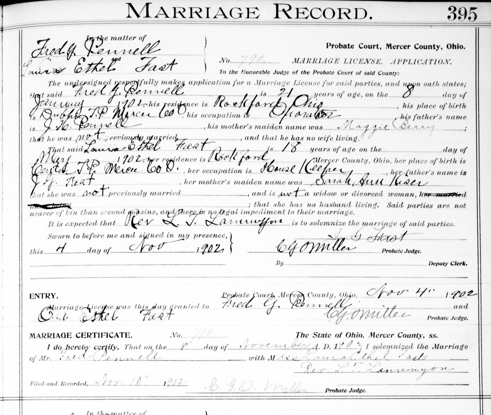 Find A Grave, database and images (https://www.findagrave.com/ ); accessed 04 April 2019), memorial page for Laura Ethel Fast Pennell (26 Jun 1884\endash 13 Dec 1967), Find A Grave Memorial no. 10147691, citing Riverside Cemetery, Rockford, Mercer County, Ohio, USA