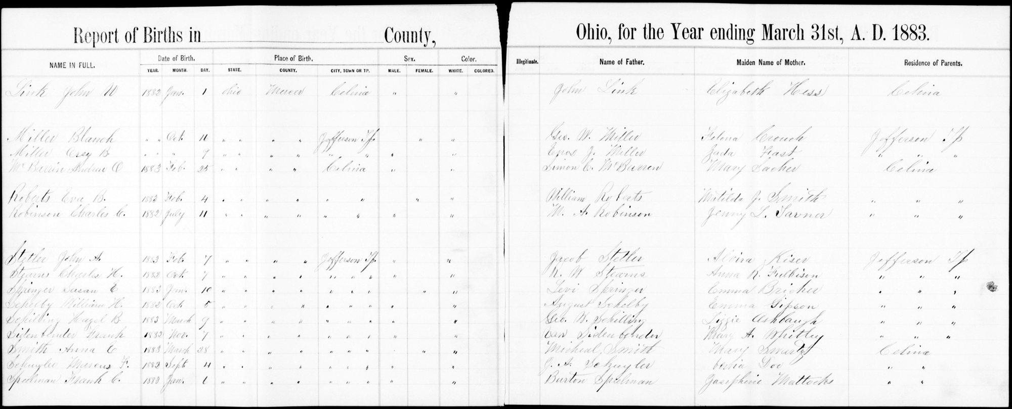 Name: Eva B. Roberts Event Type: Birth Event Date: 04 Feb 1883 Event Place: Celina, Mercer Co., Ohio, United States Gender: Female Father's Name: William Roberts Mother's Name: Matilda J. Smith