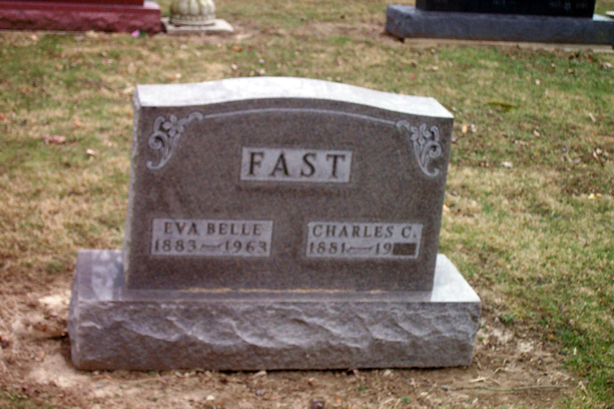 The Elm Grove Cemetery is well maintained and there are many old stones to be found there. This one particular stone has the names of Charles C. Fast and his wife, Eva Belle Fast inscribed on it. The dates for Charles only show his birth year as 1881 and there is no year of death. That could mean that he might be buried elsewhere or perhaps when he did die, the year was never engraved into the stone. The years for Eva Belle Fast reads 1883 - 1963. Find A Grave Memorial 26466118 . 2