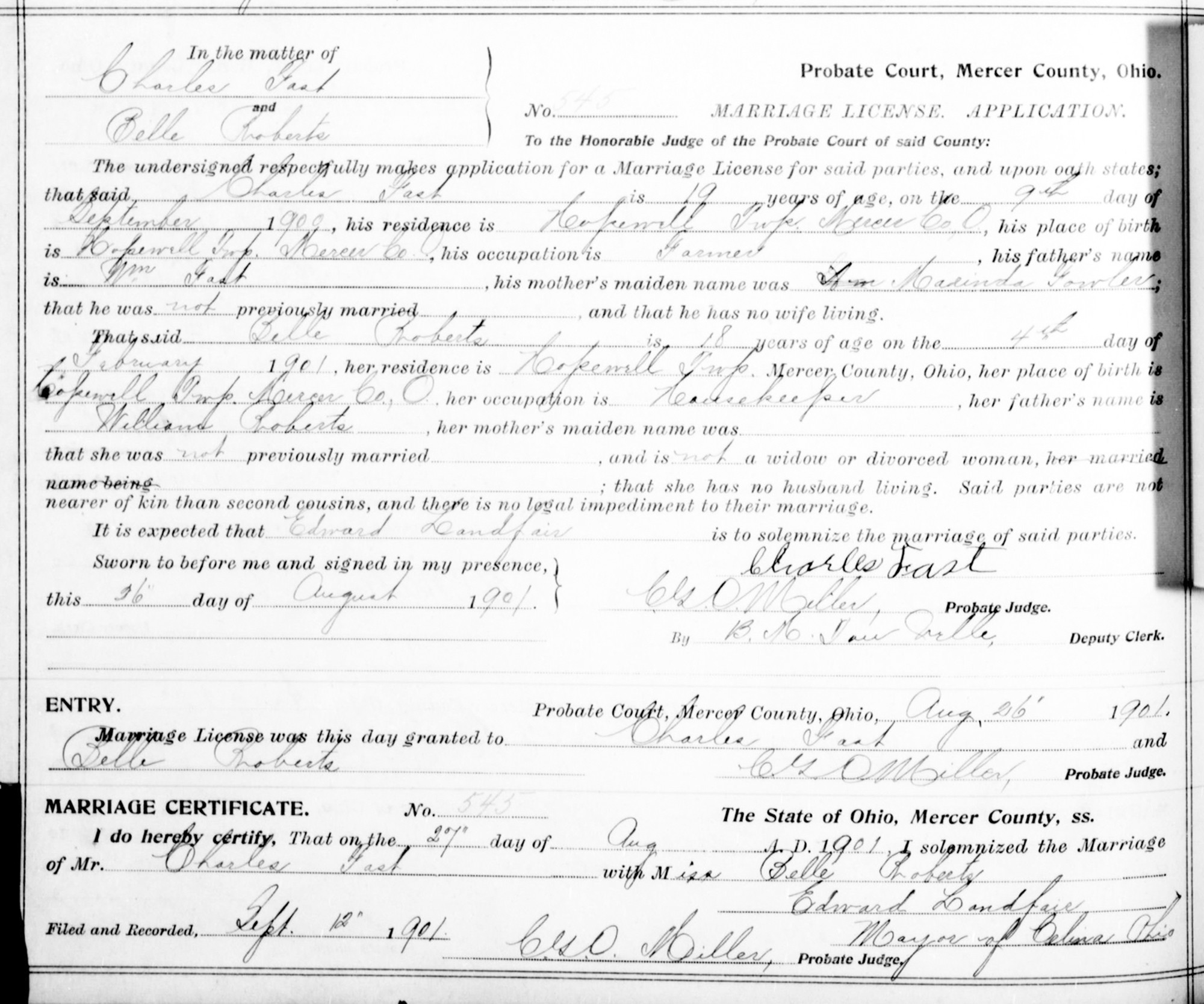 Name: Charles Fast Event Type: Marriage Event Date: 27 Aug 1901 Event Place: Mercer, Ohio, United States Age: 19 Birth Date: 9 Sep Birth Year (Estimated): 1882 Birthplace: Hopewell Twp., Mercer Co., O. Father's Name: Wm. Fast Mother's Name: Marinda Fowler Spouse's Name: Belle Roberts Spouse's Age: 18 Spouse's Birth Year (Estimated): 1883 Spouse's Birthplace: Hopewell Twp., Mercer Co., O. Spouse's Father's Name: William Roberts