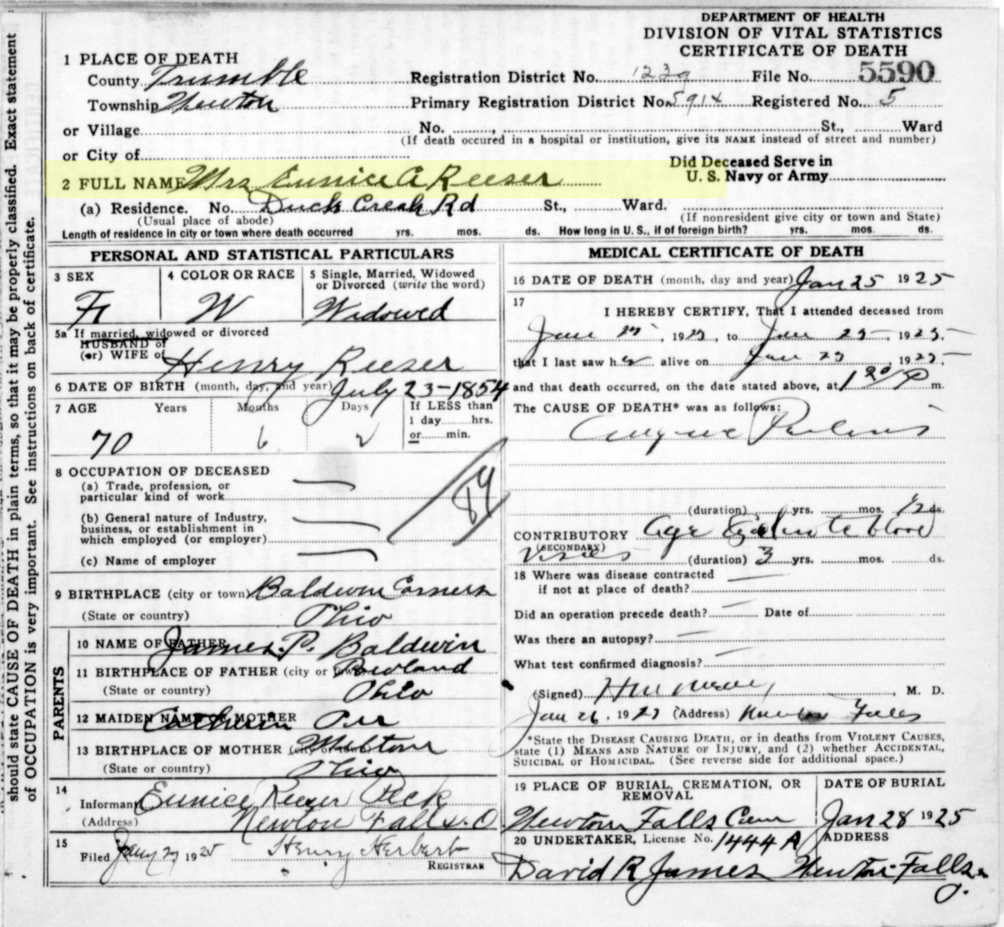 9 "Ohio Deaths, 1908-1953," database with images, FamilySearch.org (accessed 28 March 2021), (https://familysearch.org/ark:/61903/1:1:X6SW-3QR : 8 March 2021), Eunice A Reeser, 25 Jan 1925; citing Newton Twp., Trumble, Ohio, reference fn 5590; FHL microfilm 1,992,613.