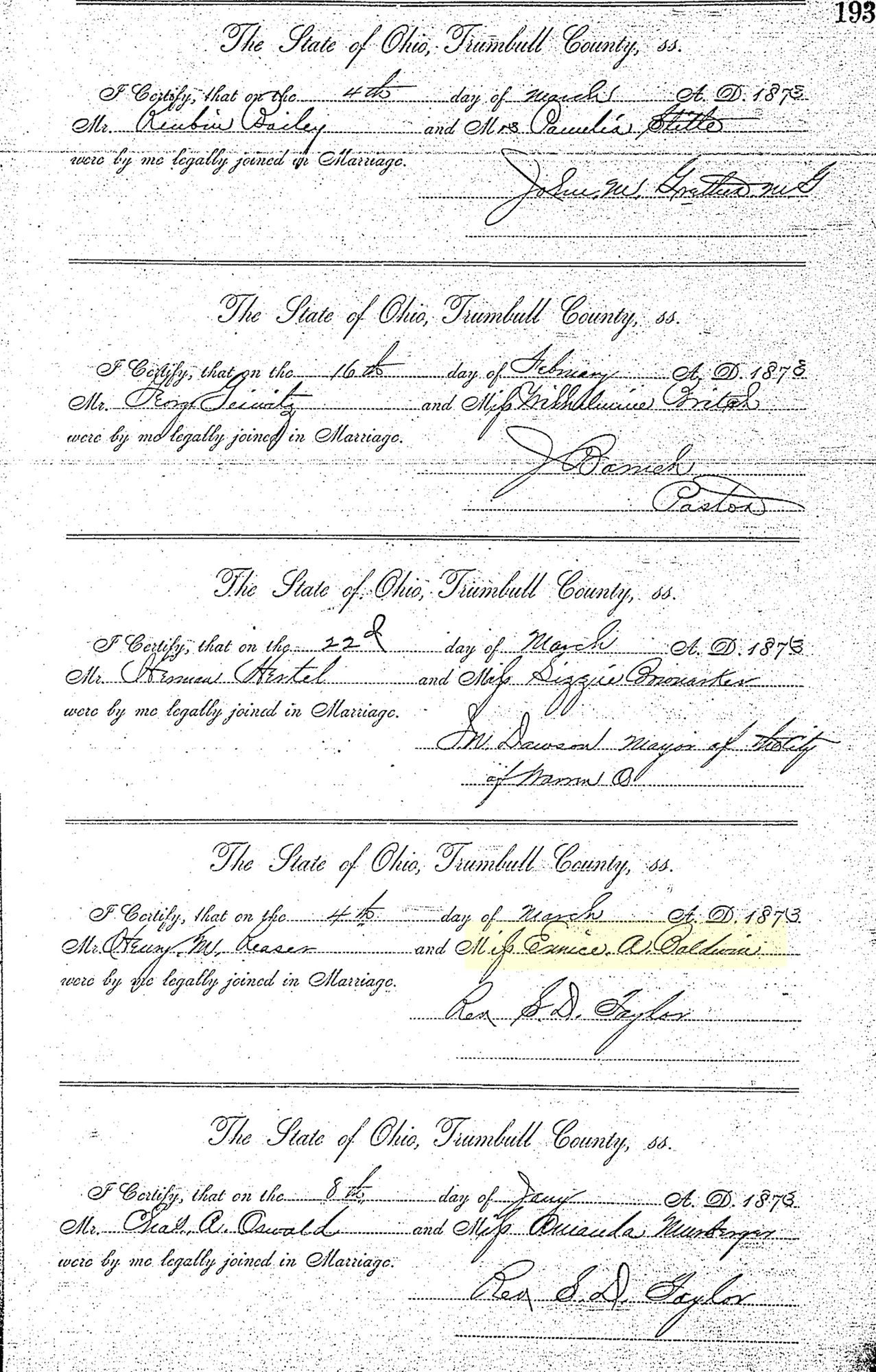 1 "Ohio, County Marriages, 1789-2016," database with images, FamilySearch.org (accessed 28 March 2021); (https://familysearch.org/ark:/61903/1:1:XZNV-SJW : 8 March 2021), Henry M. Reaser and Eunice A. Baldwin, 04 Mar 1873; citing Marriage, Trumbull, Ohio, United States, p193, Franklin County Genealogical & Historical Society, Columbus; FHL microfilm.