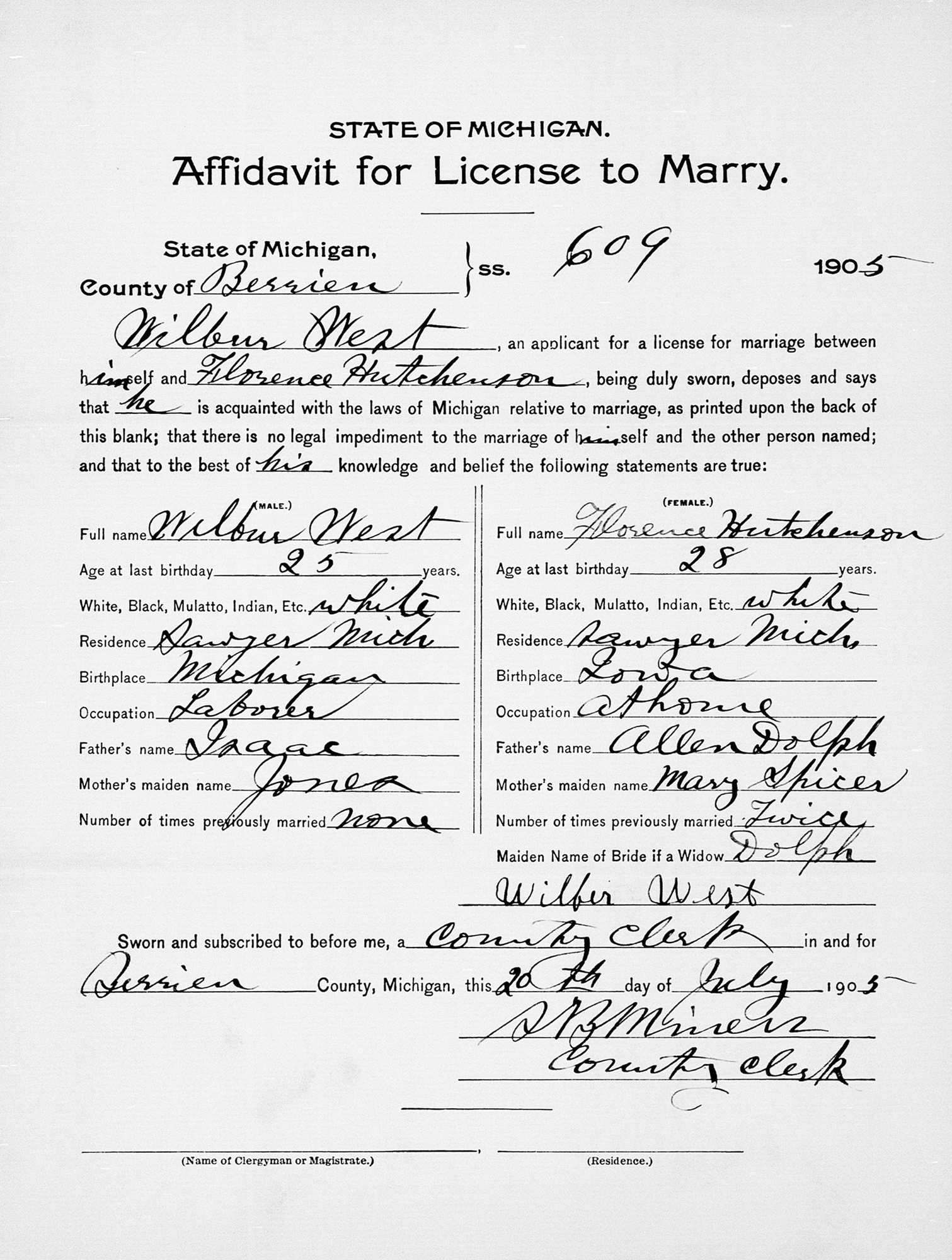 1 "Michigan, County Marriages, 1820-1940," database with images, FamilySearch.org (https://familysearch.org/search/collection/1810350 : accessed 17 Feb 2020); Wilber West and Florence Hutchenson, 20 Jul 1905; citing reference ID, various county clerks and libraries, Michigan; FHL microfilm 2,240,800.