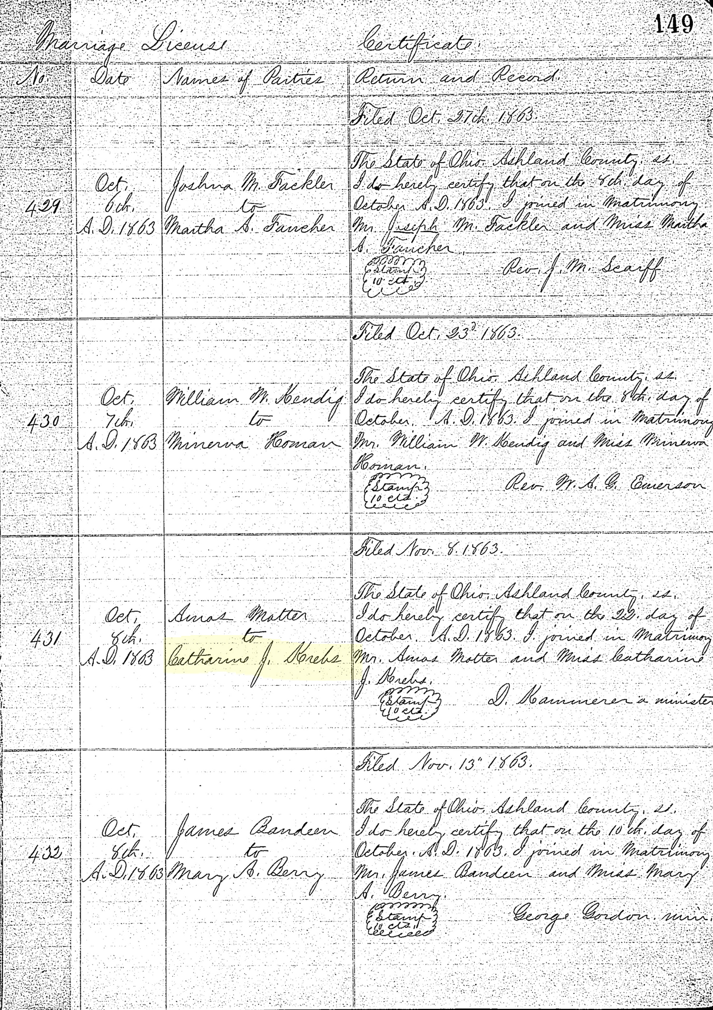 1 "Ohio, County Marriages, 1789-2016," database with images, FamilySearch.org (accessed 16 May 2021); (https://familysearch.org/ark:/61903/1:1:XZH4-BN5 : 8 March 2021), Amos Motter and Catharine J. Krebs, 22 Oct 1863; citing Marriage, Ashland, Ohio, United States, v 3 p 149 rn 431, Franklin County Genealogical & Historical Society, Columbus; FHL microfilm.