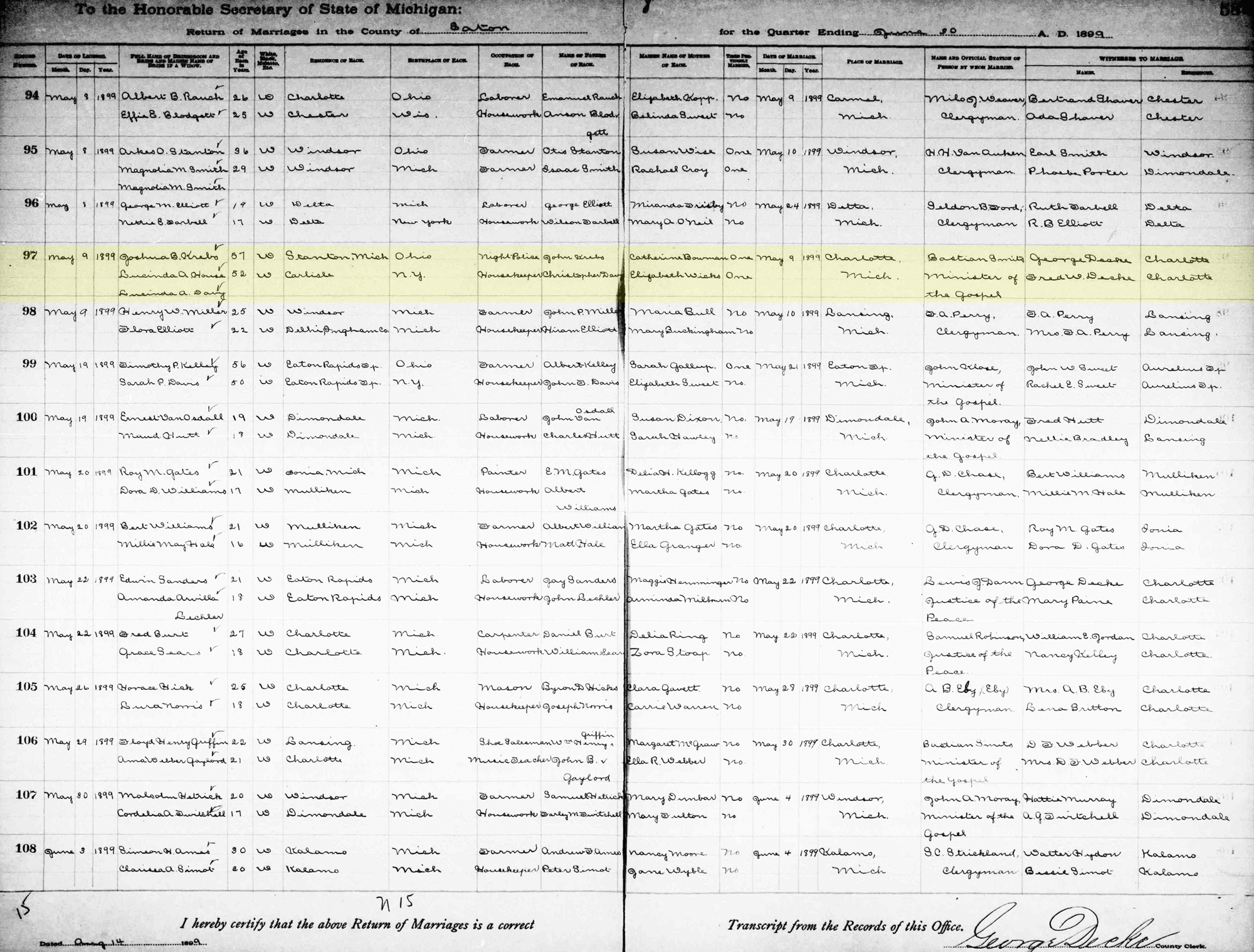• Marriage Image: 9 May 1899, in Charlotte, MI. 1 • They appeared on the 1900 US Census in Stanton, MI on 11 June 1900. 2 • They appeared on the 1910 US Census in Stanton, MI on 3 May 1910. 3