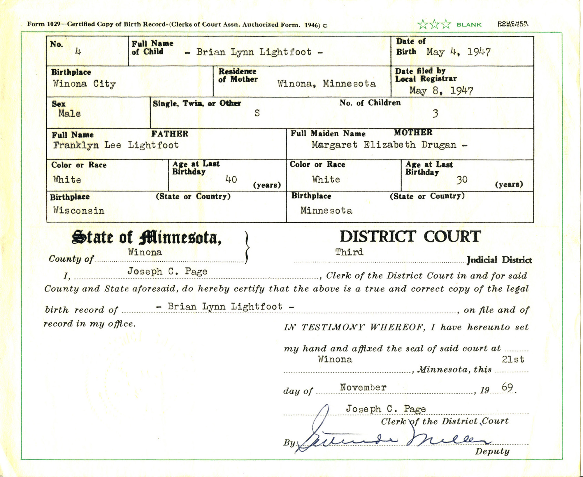 Name: Brian Lynn Lightfoot Event Type: Birth Event Date: 04 May 1947 Event Place: Winona, Minnesota, United States Father's Name: Franklyn Lee Lightfoot Mother's Name: Margaret Elizabeth Drugan File Number: 1947-MN-058704