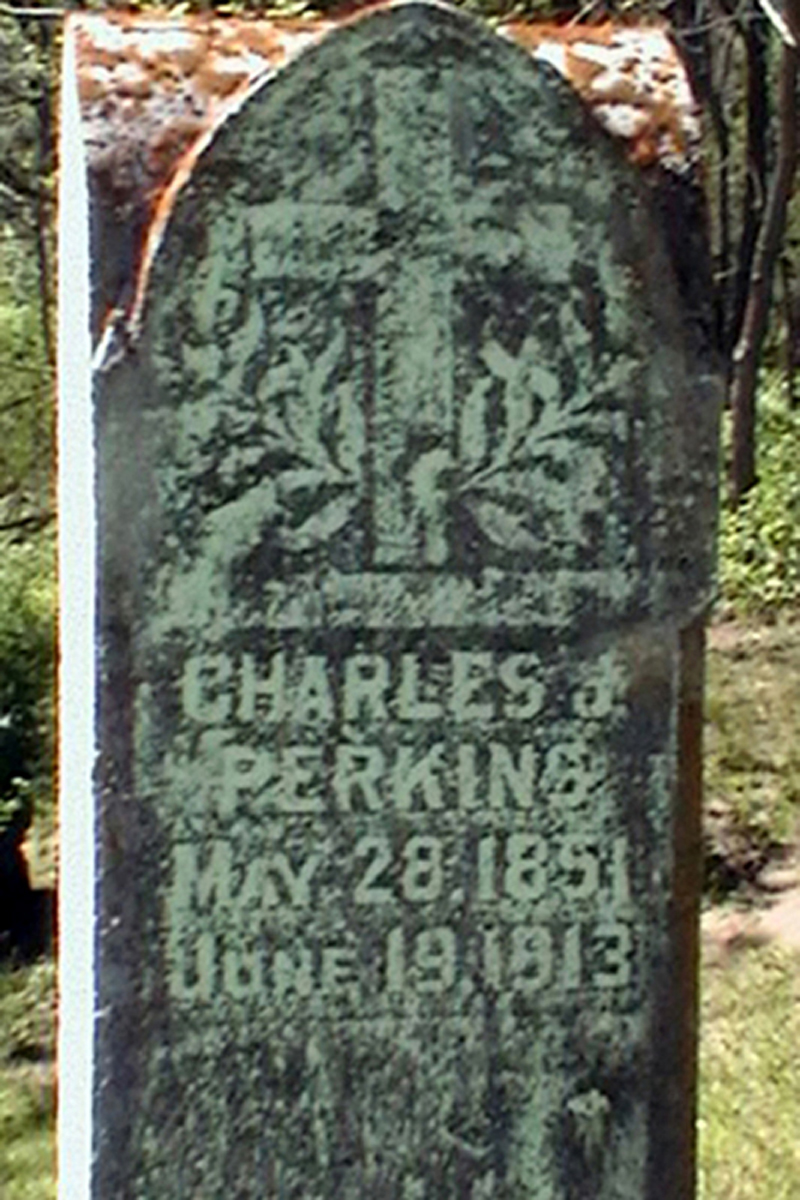 Lot 27, Grave 3; Lot Owner = Charles Perkins His gravestone reads "Charles J. PERKINS, May 28, 1851- June 19, 1913" (barely legible)