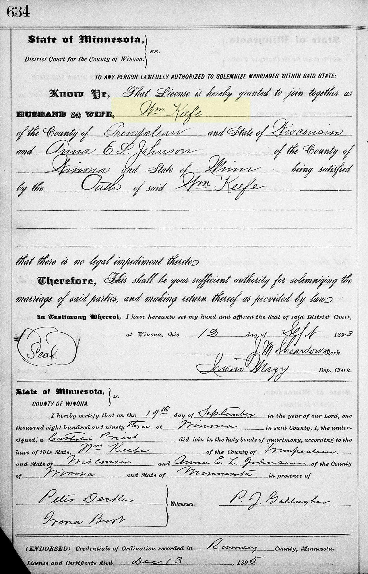 1 "Minnesota, County Marriages, 1860-1949," database with images, FamilySearch (https://familysearch.org/search/collection/1803974 : accessed 7 November 2020), (https://www.familysearch.org/ark:/61903/1:1:Q2M5-FCQM : 15 May 2020), Wm Keefe and Anna E L Johnson, 1893.