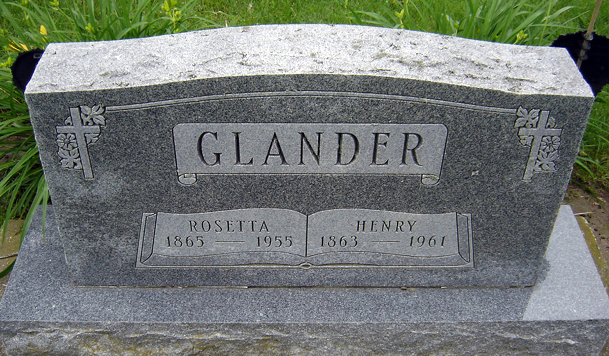 She was buried after 24 June 1955 in the Saint John's Cemetery in Mayville, WI. Rosetta married Heinrich F. Glander, son of Christian Glander and Frederica Pagel, on 31 December 1891 in Hubbard, WI.1 2 3 4 5 6 (Heinrich F. Glander was born on 23 March 1863 in Hubbard, WI,1 2 3 4 5 6 11 died in 1961 11 and was buried in 1961 in Mayville, WI 11.)