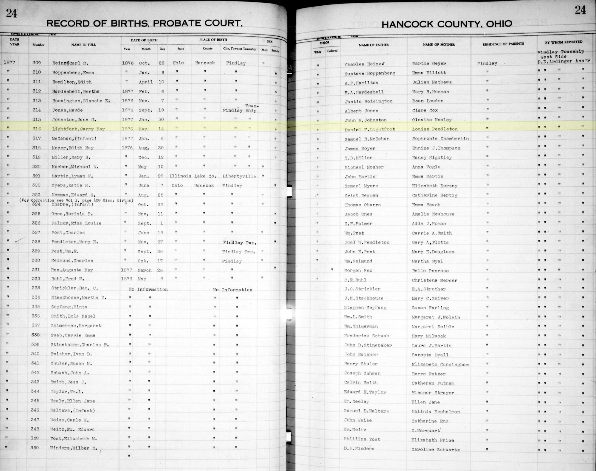6 "Ohio, County Births, 1841-2003," database with images, FamilySearch (accessed 1 Jun 2014); Carry May Lightfoot, 14 May 1876; citing Birth, Findlay, Hancock, Ohio, United States, multiple county courthouses, Ohio; FHL microfilm 961,861.