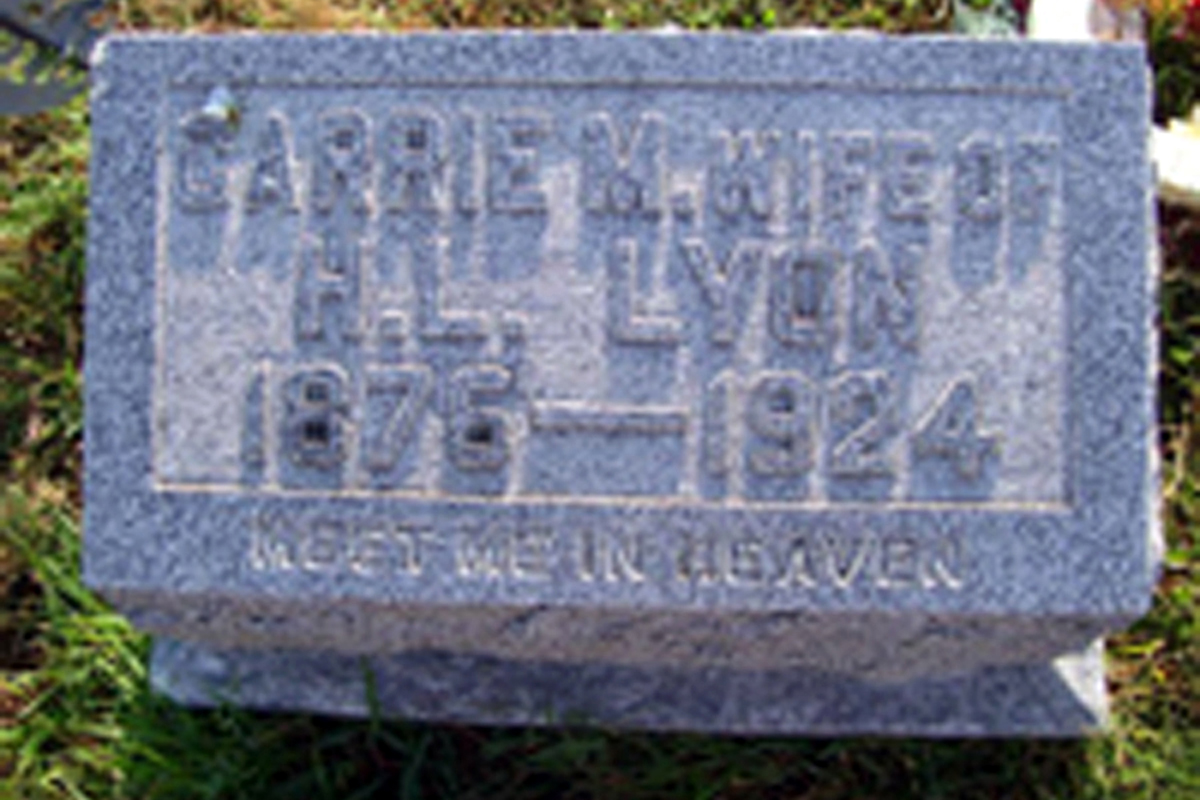 Carrie next married Henry Lyman Lyon, son of E. S. Lyon and Eliza Deming, on 20 October 1914 in , Hancock County, OH.3 4 5 (Henry Lyman Lyon was born on 28 November 1869 in Allen Township, Hancock, OH,5 13 died on 19 March 1949 in Findlay, OH 13 and was buried after 19 March 1949 in , Hancock County, OH 13.)