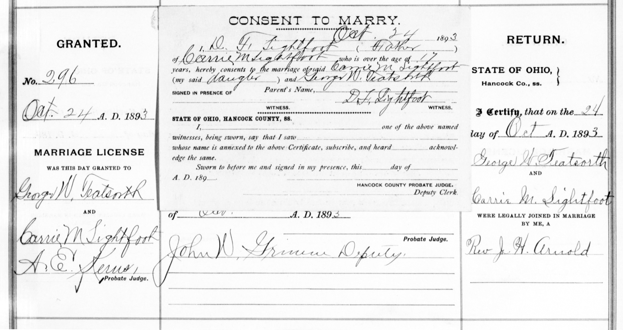 2 "Ohio, County Marriages, 1789-2016," database with images, FamilySearch.org (accessed 6 Feb 2020); George W. Teatsorth and Carrie M. Lightfoot, 24 Oct 1893; citing Marriage, Hancock, Ohio, United States, Franklin County Genealogical & Historical Society, Columbus; FHL microfilm.