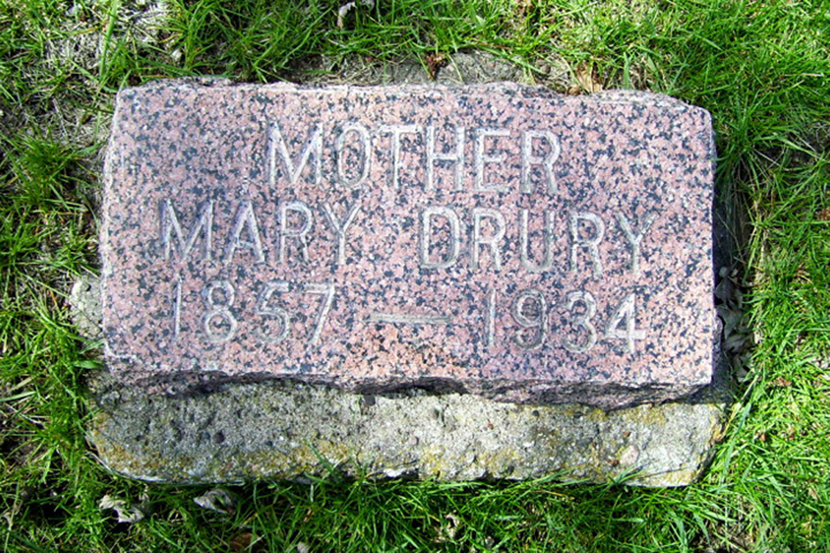 10 Find A Grave, database and images (https://www.findagrave.com/ ); accessed 28 November 2018), memorial page for Mary Kramer Drury (22 May 1857\endash 2 May 1934), Find A Grave Memorial no. 51336053, citing Elmhurst Cemetery, Saint Paul, Ramsey County, Minnesota, USA