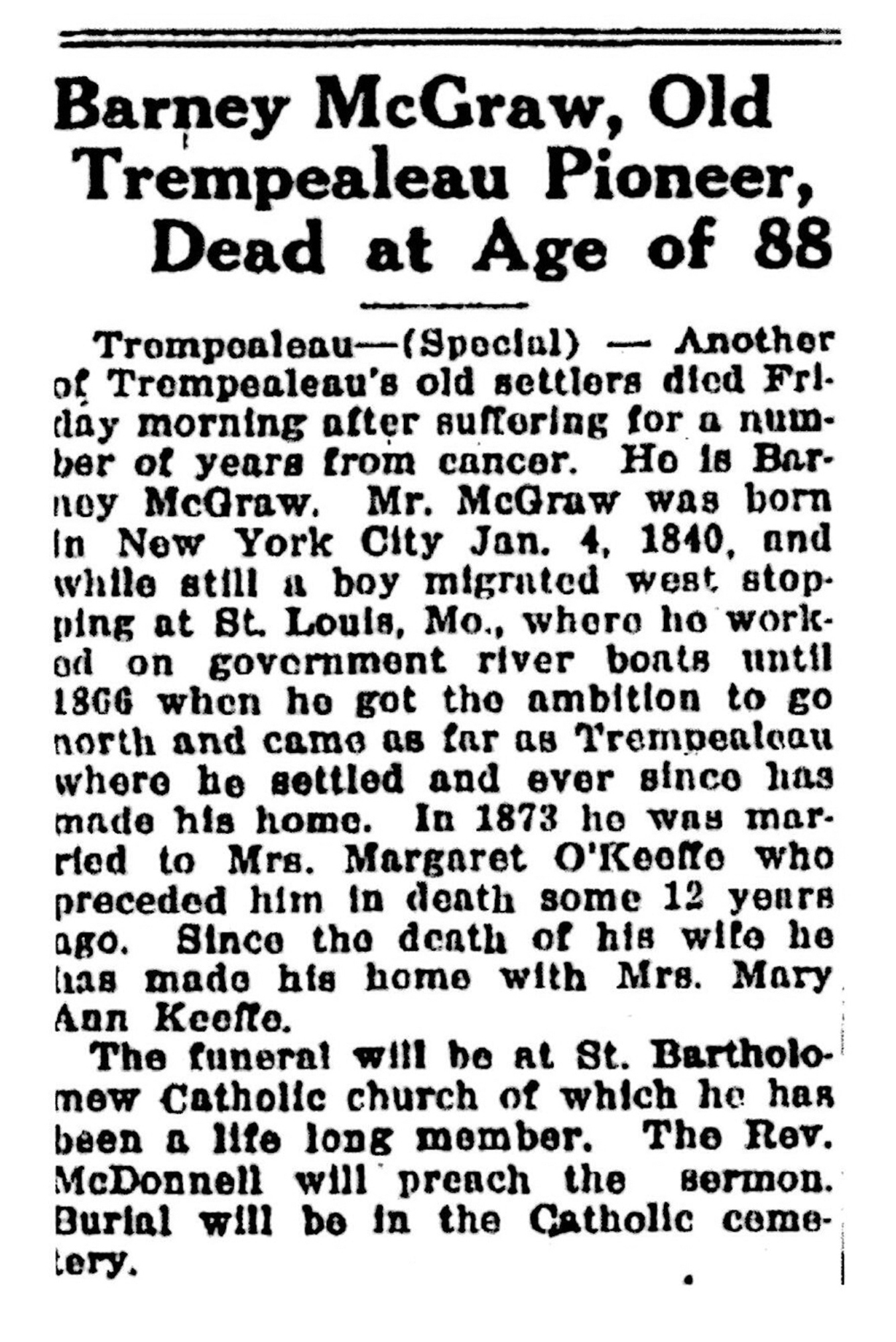 • He has alternate birth date of 1843 and a birth location of New York. • He has alternate birth date of 1845 and a birth location of New York. • He has alternate birth date of 1847 and a birth location of New York. • He appeared on the 1870 US Census in Trempealeau, WI on 11 June 1870. 6 • He appeared on the 1880 US Census in Trempealeau, WI on 1 June 1880. 1 • He appeared on the 1900 US Census in Trempealeau, WI on 2 June 1900. 2 • He appeared on the 1905 Wisconsin State Census in Trempealeau, WI in June 1905. 3 • He appeared on the 1910 US Census in Trempealeau, WI on 15 April 1910. 4 • He appeared on the 1920 US Census in Trempealeau, WI on 5 January 1920. 7 • He was buried after 20 September 1928 in the Old Catholic Cemetery in Trempealeau, WI.
