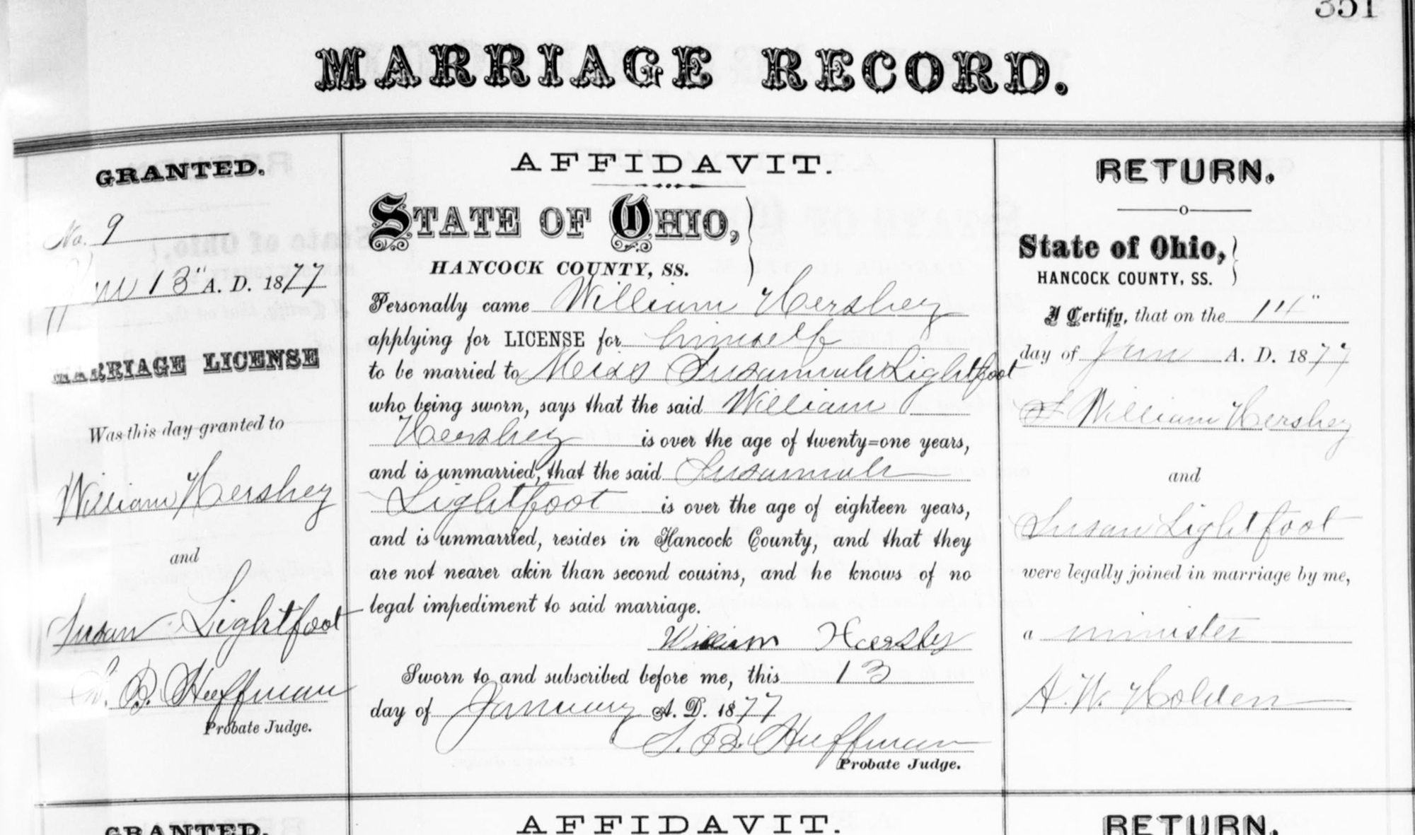 1 "Ohio, County Marriages, 1789-2016," database with images, FamilySearch.org (accessed 7 Jun 2014); William Hershey and Susan Lightfoot, 14 Jan 1877; citing Marriage, Hancock, Ohio, United States, V6, P.351, N.9, Franklin County Genealogical & Historical Society, Columbus; FHL microfilm.
