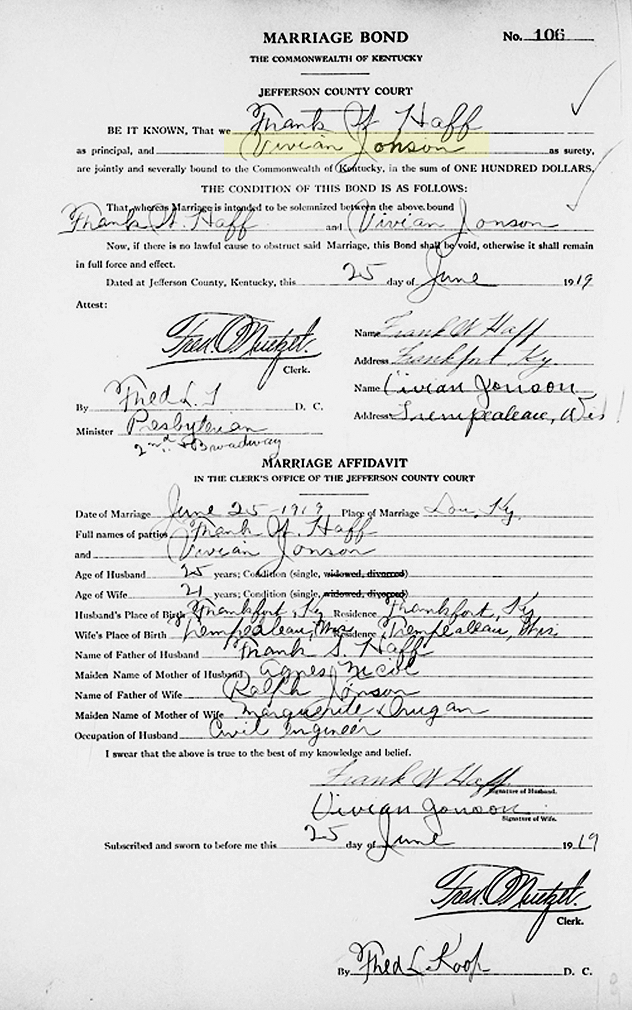 2 "Kentucky Marriages, 1785-1979," index, FamilySearch.org (https://familysearch.org/search/collection/1674849 : accessed 13 Nov 2014), groom's name: Frank W. Haff; bride's name: Vivian Jonson; marriage date: 25 Jun 1919.