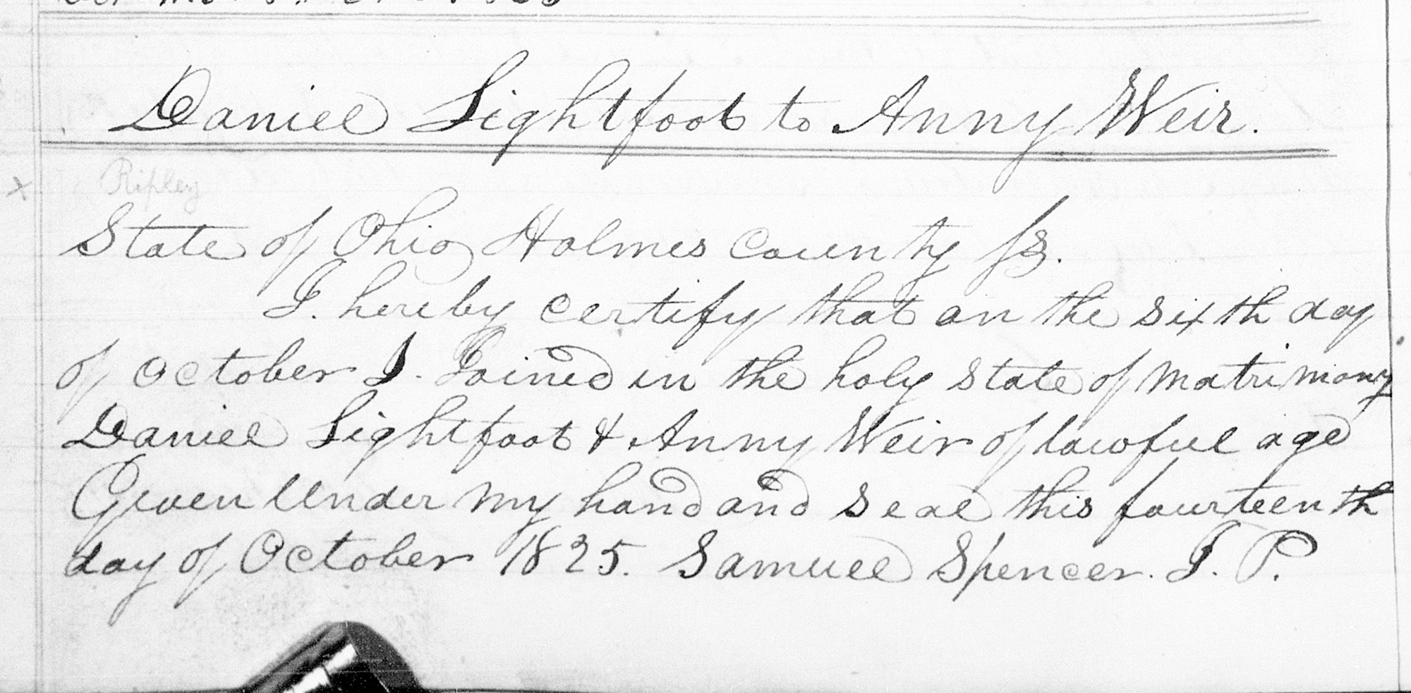 3 "Ohio, County Marriages, 1789-2016," database with images, FamilySearch.org (accessed 2 Jul 2020); Daniel Lightfoot and Anny Weir, 06 Oct 1825; citing Marriage, Holmes, Ohio, United States, 031, Franklin County Genealogical & Historical Society, Columbus; FHL microfilm.