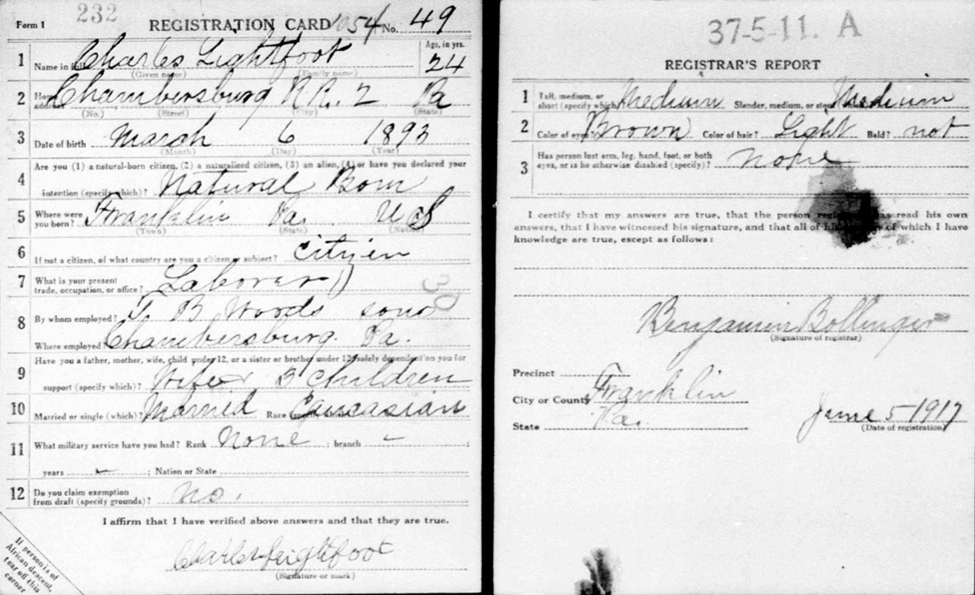 7 "United States World War I Draft Registration Cards, 1917-1918," database with images, FamilySearch.org (accessed 29 Oct 2013); Name: Charles Lightfoot; citing Franklin County no 2, Pennsylvania, United States, NARA microfilm publication M1509, (Washington D.C.: National Archives and Records Administration, n.d); FHL microfilm 1892183.