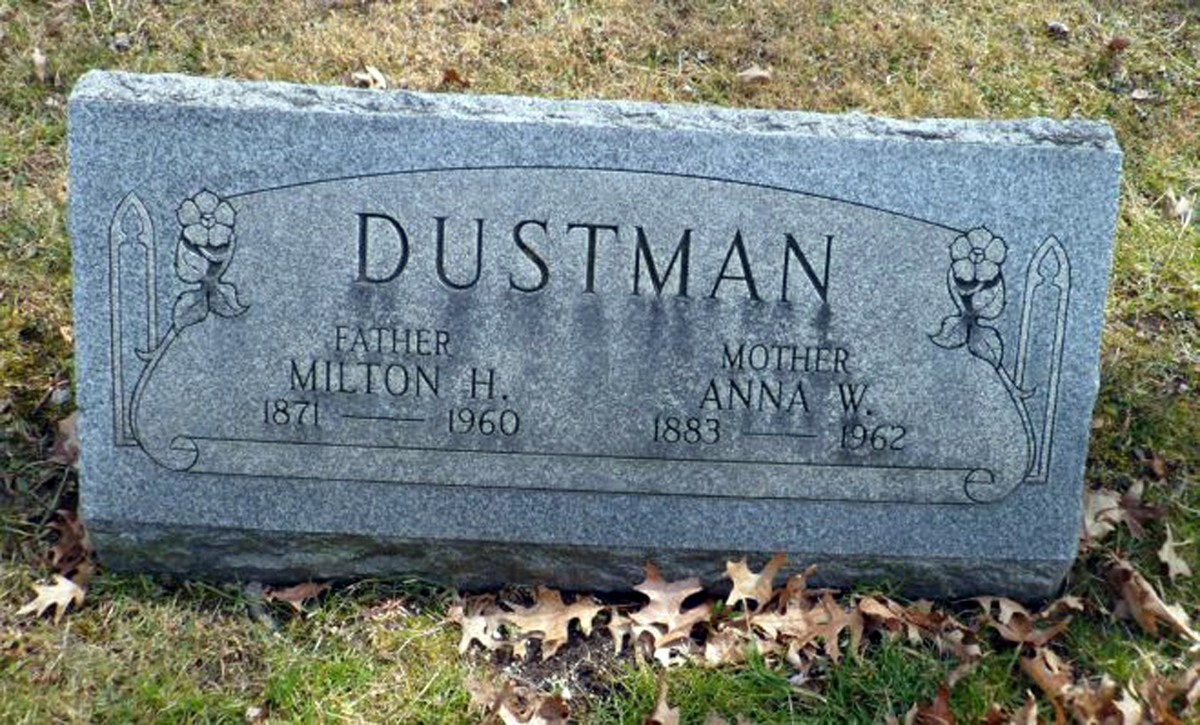 Find A Grave, database and images (https://www.findagrave.com/ ); accessed 26 May 2021, memorial page for Milton H. Dustman (25 May 1871-2 Jul 1960), Find a Grave Memorial ID 75686556, citing Alliance City Cemetery, Alliance, Stark County, Ohio, USA