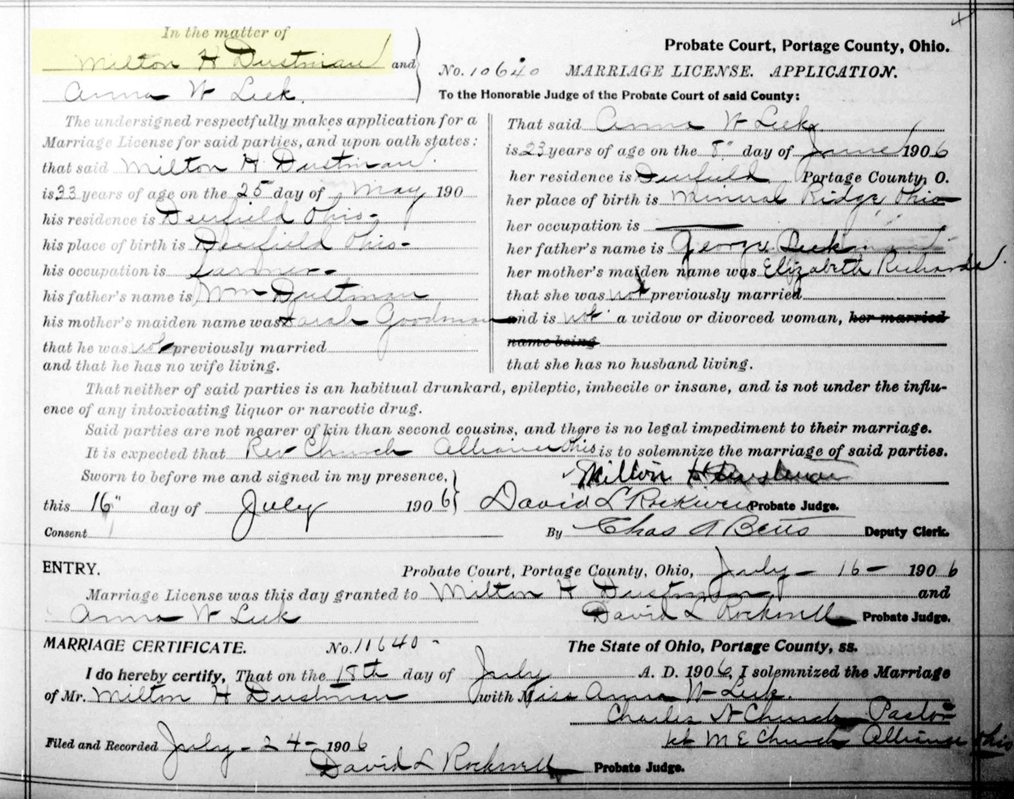 1 "Ohio, County Marriages, 1789-2016," database with images, FamilySearch.org (accessed 26 May 2021); (https://familysearch.org/ark:/61903/1:1:X8JH-WZH : 8 March 2021), Milton H. Dustman and Anna W. Leek, 18 Jul 1906; citing Marriage, Portage, Ohio, United States, 259, Franklin County Genealogical & Historical Society, Columbus; FHL microfilm.