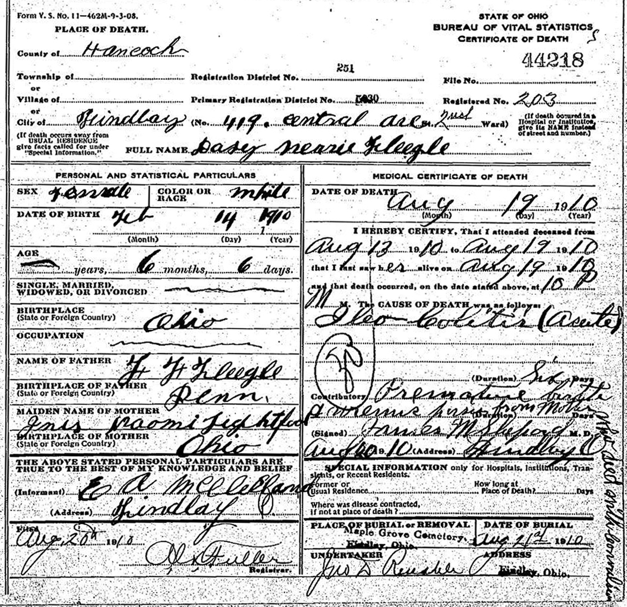 Find A Grave, database and images (https://www.findagrave.com/ ); accessed 05 April 2019), memorial page for Daisy Marie Fleegle (14 Feb 1910\endash 19 Aug 1910), Find A Grave Memorial no. 51076404, citing Maple Grove Cemetery, Findlay, Hancock County, Ohio, USA