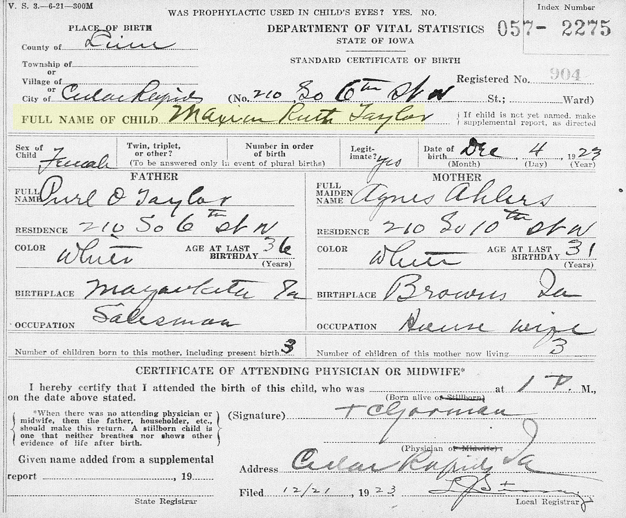 3 "Iowa, Birth Records, 1921-1942," database, FamilySearch (https://www.familysearch.org/search/collection/2849548 : accessed 8 Oct 2019), Maxine Ruth Taylor, 4 Dec 1923; citing Birth, Cedar Rapids, Linn, Iowa, United States, State Historical Society of Iowa, Des Moines.
