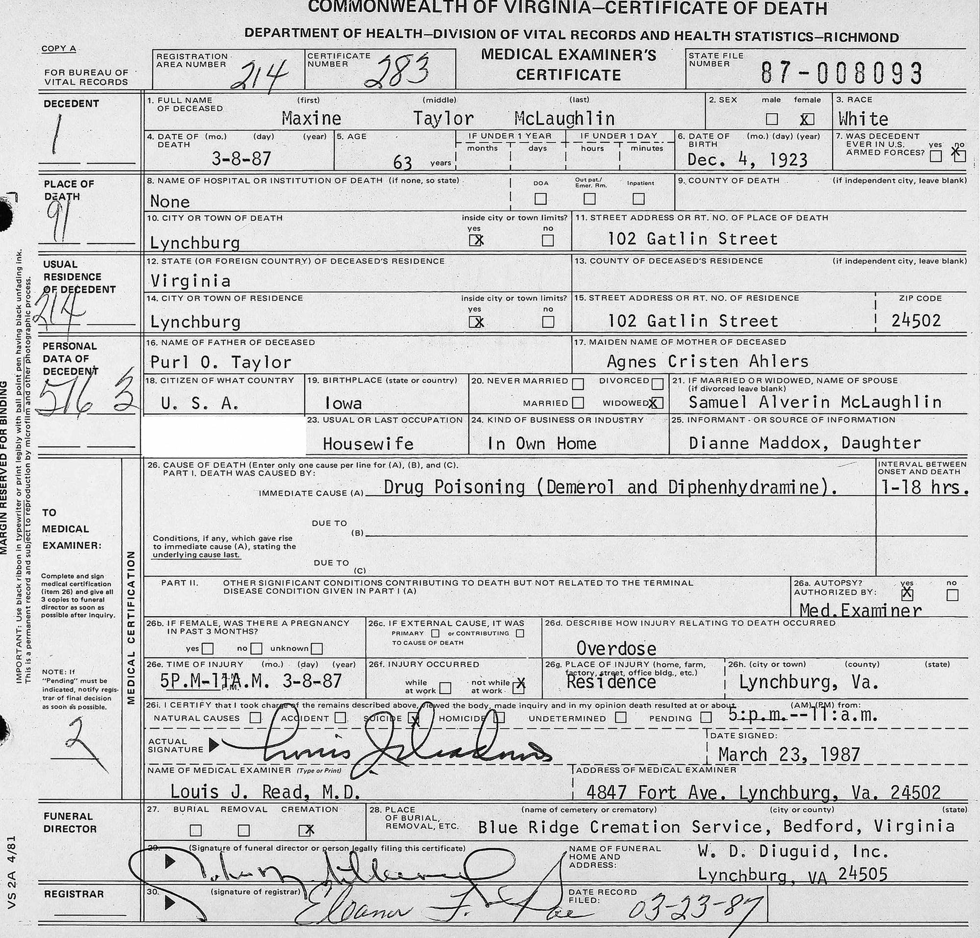 • Death Image: 8 March 1987, in Lynchburg, VA. 4 Maxine married Samuel Alverin McLaughlin, son of James Samuel McLaughlin and Laura May Michel, on 16 May 1942 in Cedar Rapids, IA.1 2 (Samuel Alverin McLaughlin was born on 27 March 1921 in Iowa City, IA,2 5 6 7 8 9 10 died on 4 October 1986 in Lynchburg, VA 2 9 10 and was cremated after 4 October 1986 in Bedford, VA 9.) |